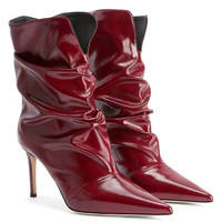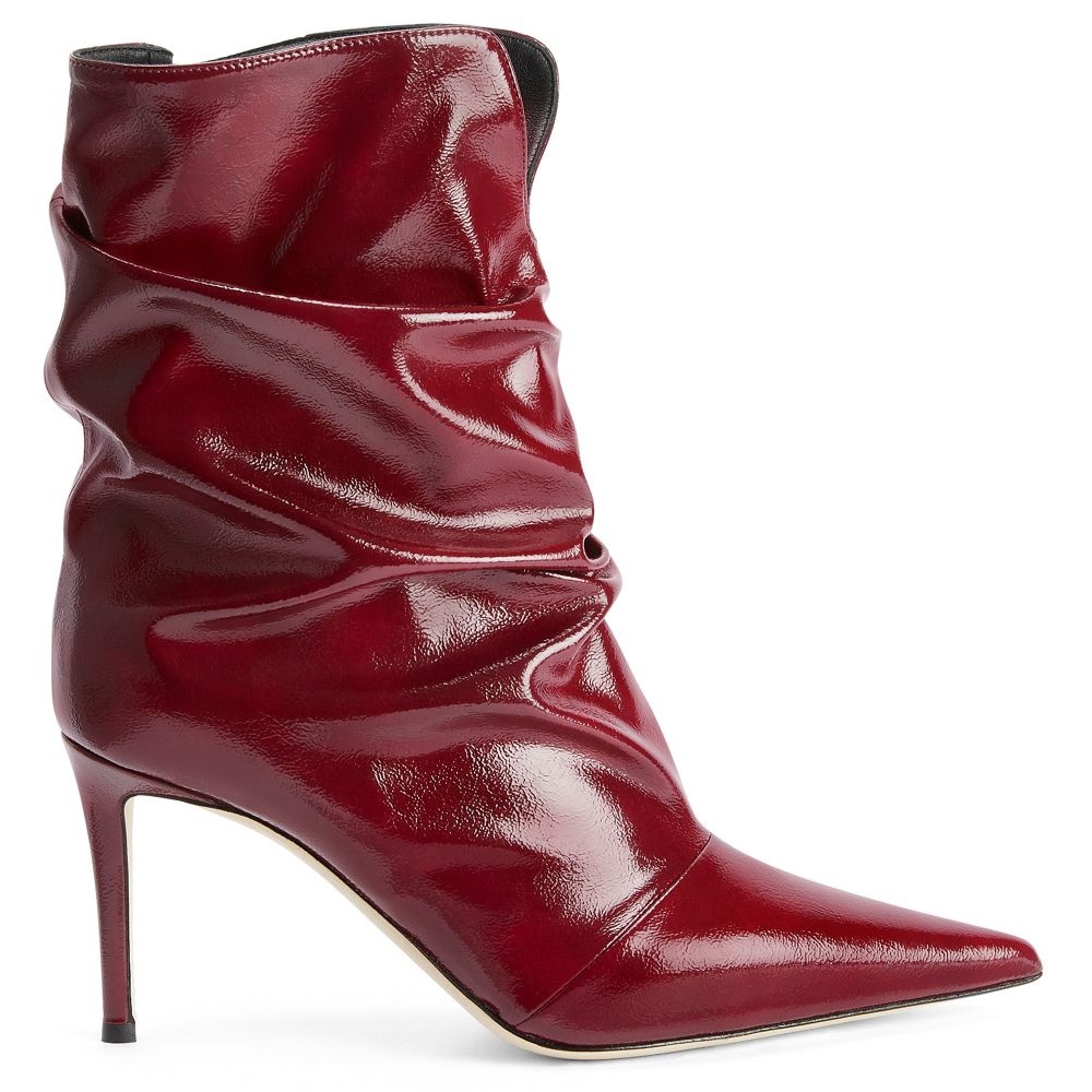 Product Details These ankle boots are crafted from patent-effect burgundy synthetic fabric and feature a soft shaft, matching covered stiletto heels and a leather sole. Patent-effect burgundy synthetic fabric Heel covered in patent-effect burgundy synthetic fabric 85 mm heel Leather sole with logo Made in Italy
