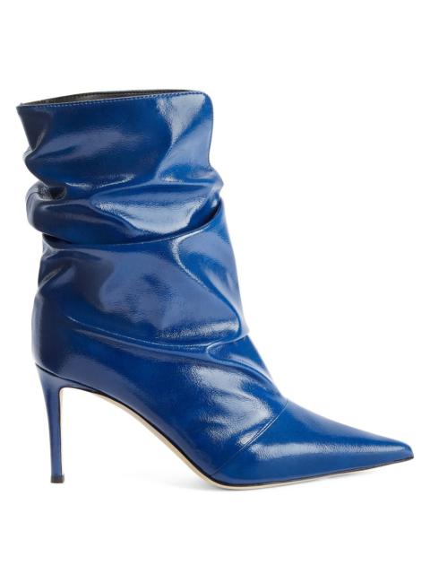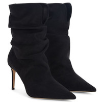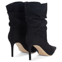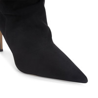 Product Details These pointed-toe ankle boots crafted from black synthetic fabric with suede effect feature a soft shaft, matching covered stiletto heels and a leather sole. Black suede effect synthetic fabric (55% CO; 32% PL; 13% PU) Heel covered in black synthetic fabric with suede effect 85 mm heel Leather sole with logo Made in Italy