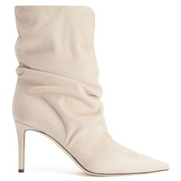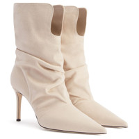 Product Details These ankle boots crafted from beige synthetic fabric with suede effect feature a soft shaft, a matching covered stiletto heel and a leather sole. Synthetic fabric with beige suede effect (55% CO; 32% PL; 13% PU) Heel covered in beige synthetic fabric with suede effect 85 mm heel Leather sole with logo Made in Italy