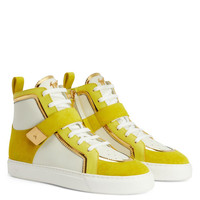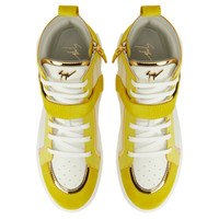 Product Details High-top sneakers crafted from off-white and yellow leather, yellow velour and golden mirror-effect synthetic fabric; the design features white cotton laces, a white rubber sole, a strap with a golden metal plaque with logo and a golden metal 'Signature' detail on the tongue. Off-white and yellow leather, yellow velour and golden mirror-effect synthetic fabric Golden metal 'Signature' detail Strap with golden metal plate White cotton laces White rubber sole with logo Made in Italy