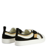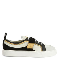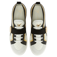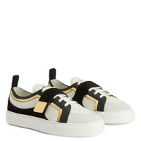 Product Details Low-top sneakers crafted from off-white and black leather, black velour and golden mirror-effect synthetic fabric; the design features white cotton laces, a white rubber sole, a strap with a golden metal plaque with logo and a golden metal 'Signature' detail on the tongue. Off-white and black leather, black-and-white velour, golden mirror-effect synthetic fabric Golden metal 'Signature' detail Strap with golden metal plate White cotton laces White rubber sole with logo Made in Italy