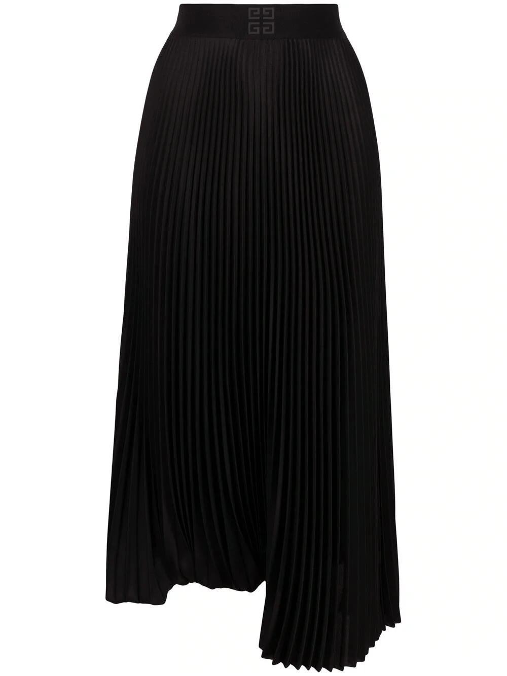 4G asymmetric pleated skirt Evoking Givenchy's elegant yet edgy aesthetic for AW21, this skirt is adorned with a signature 4G motif on its elasticated waistband and falls asymmetrically into a bellow-the-knee length pleated design for added movement. Made in Italy Composition Polyester 100%, Cotton 88%, Spandex/Elastane 12% SIZE & FIT Model measurements Height 5 ft 11 in(1.8 m) Bust/Chest 32.67 in(83 cm) Hips 36.22 in(92 cm) Waist 24.4 in(62 cm) FittingInformation This piece fits true to size. We recommend you get your regular size Designed for a loose fit with a close fit at the waist Made with a mid-weight non-stretch fabric Washing instructions Dry Clean Only