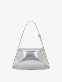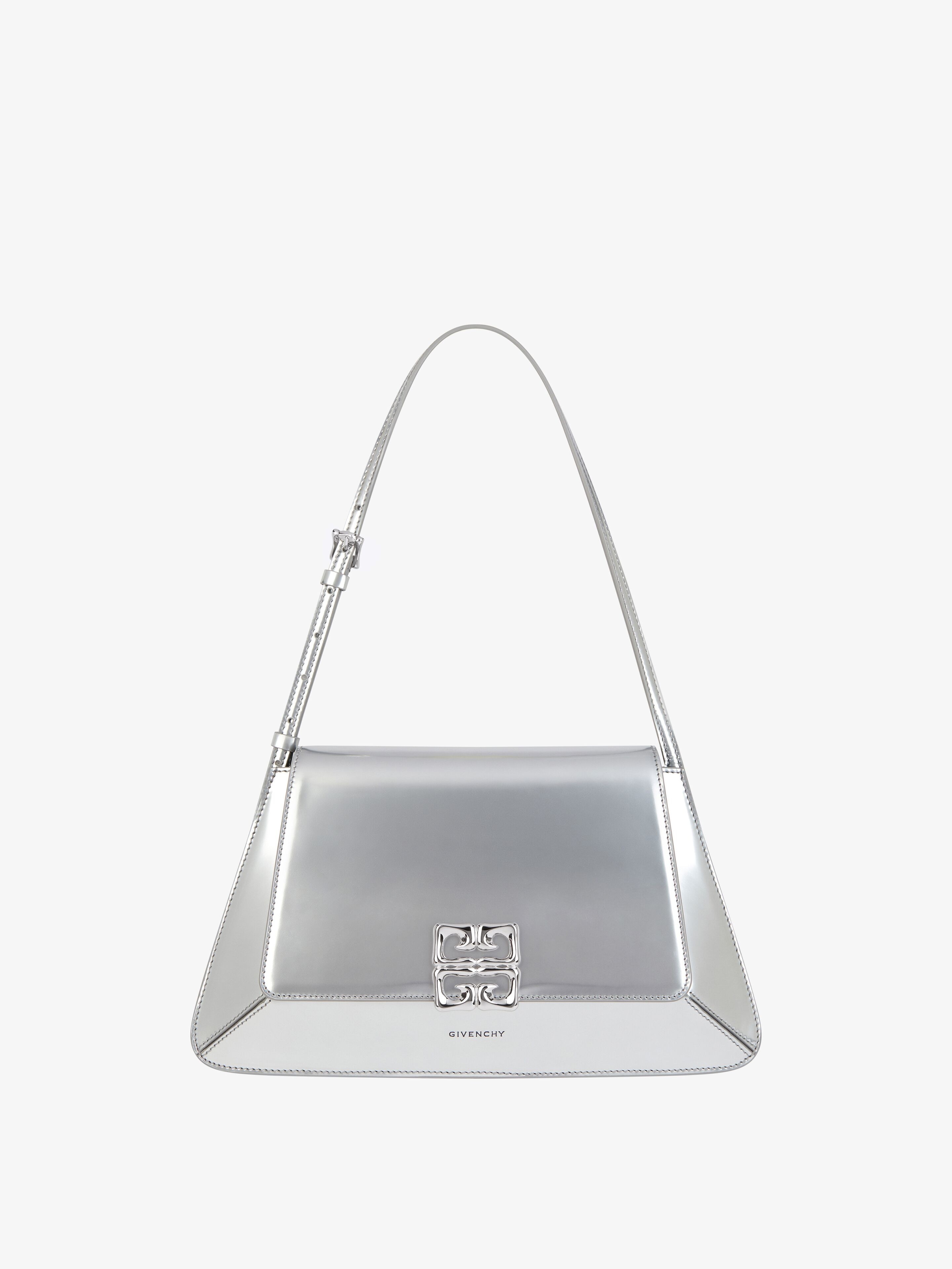 - Shoulder bag in laminated calfskin leather. - 4G Liquid line. - Flap with 4G Liquid magnetic metal clasp. - Double soufflet construction. - Adjustable leather shoulder strap. - GIVENCHY signature embossed on the front and on the back. - Silvery-finish metal details. - One main compartment and one card slot inside.