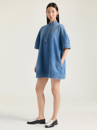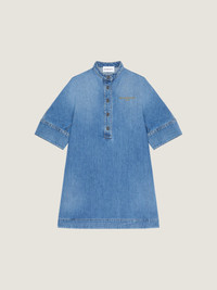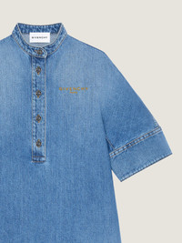 - Short shirt dress with short-sleeves in washed denim. - Mao collar. - GIVENCHY engraved buttons. - Small GIVENCHY Paris signature embroidered on the chest. - Button tab on the front.