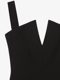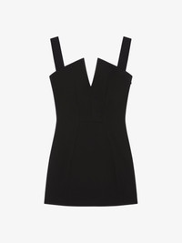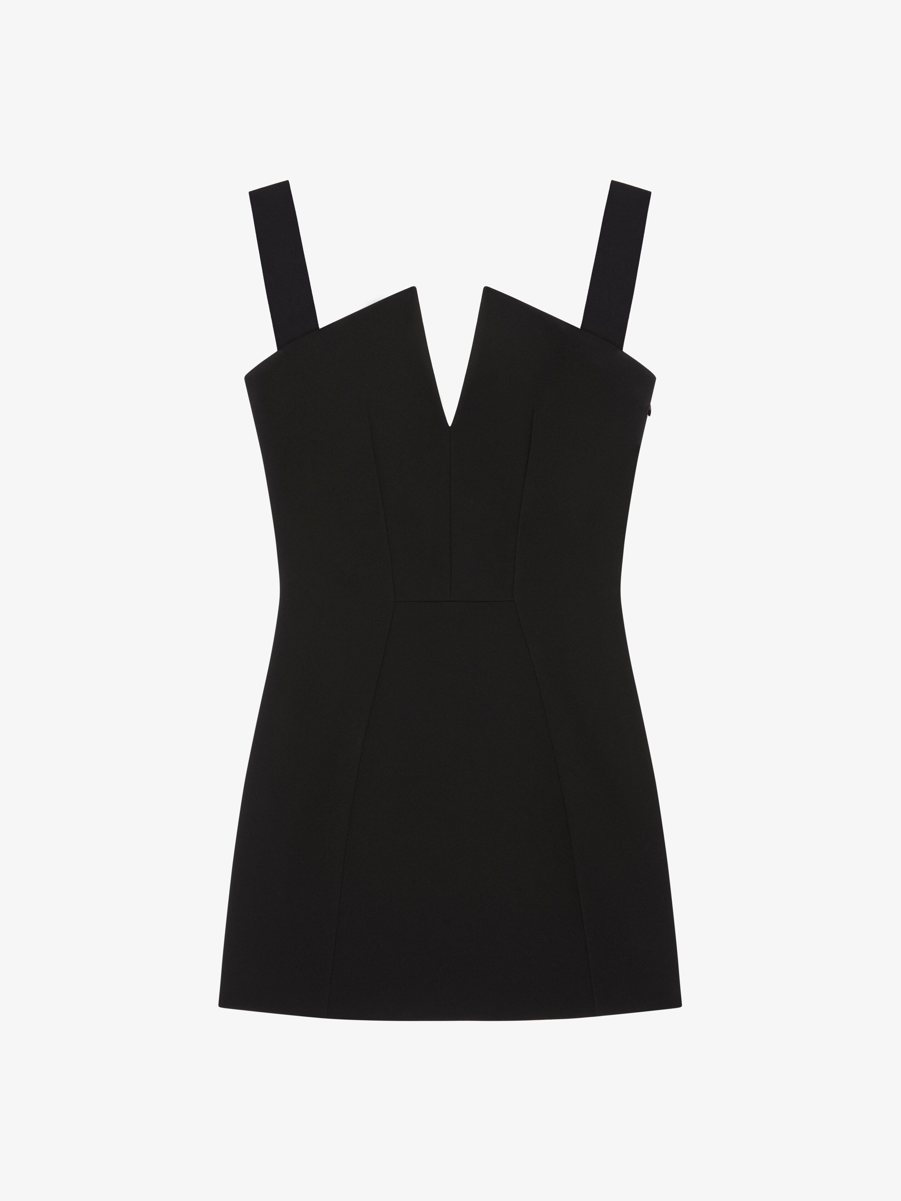- Mini straps dress in crepe. - Graphic V neckline. - Invisible zipped closure on the side. - Low back. - Fitted cut. - Model measures 5.8 Feet and wears a size 36.