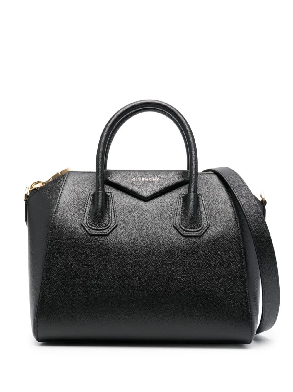 small Antigona leather bag Highlights - Black - Calf leather - Grained texture - Logo stamp to the front - Branded zip puller - Internal logo patch - Gold-tone hardware - Top zip fastening - Two rolled top handles - Detachable shoulder strap - Main compartment - Internal zip-fastening pocket - Internal slip pocket - Canvas lining - This piece comes complete with a protective dust bag. Made in Italy Composition Outer: Calf Leather 100% SIZE & FIT Measurement DEPTH 5.9 in(15 cm) HANDLE 3.93 in(10 cm) HEIGHT 9.84 in(25 cm) STRAP 13.77 in(35 cm) WIDTH 11.02 in(28 cm)