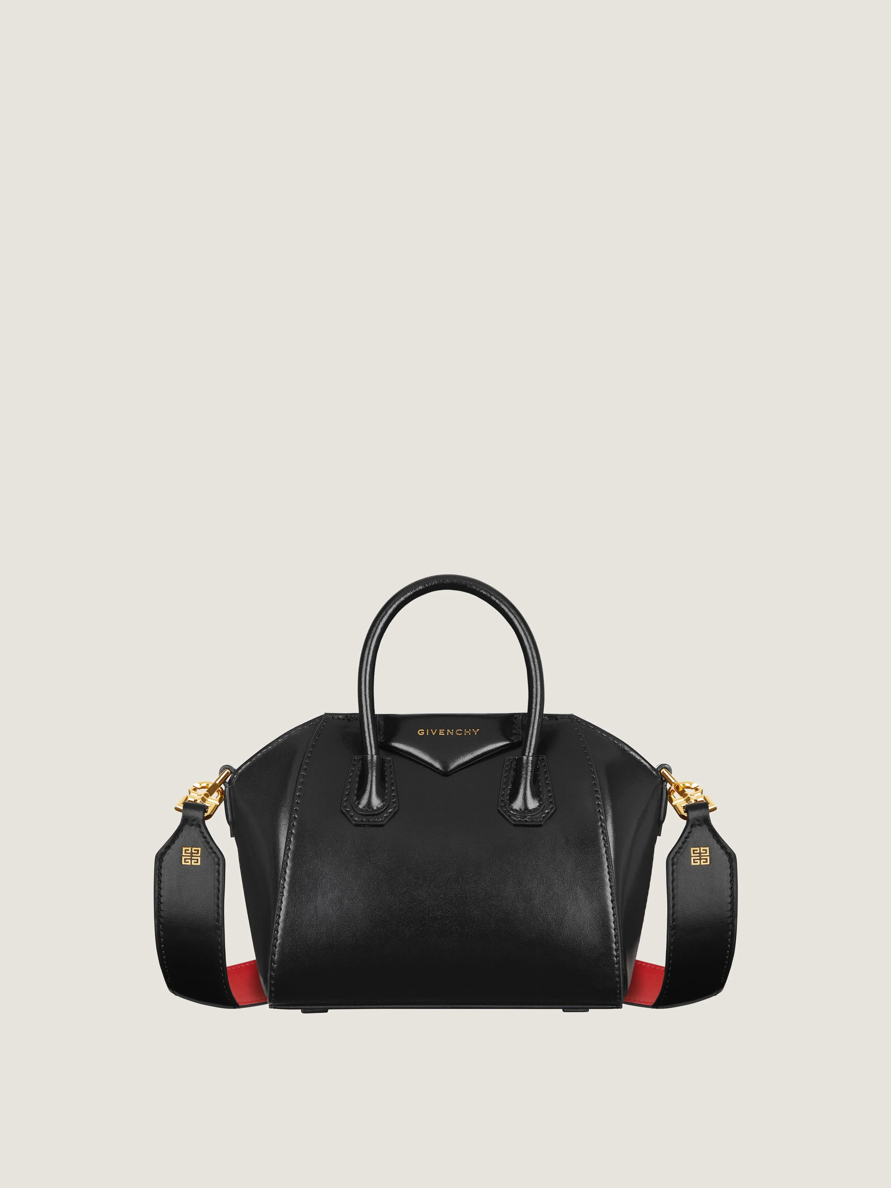 - Mini handbag or crossbody bag in Box calfskin leather. - Antigona Toy line. - Magnetic closure. - Pentagonal patch with embossed GIVENCHY signature. - Large removable bicolored leather shoulder strap with embossed GIVENCHY signature on the top and 4G emblems on the ends. - Golden-finish metal details. - One main compartment and one inside flat pocket. - Contrasting lining. - Handle : 5.5 in.