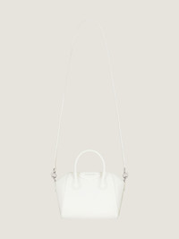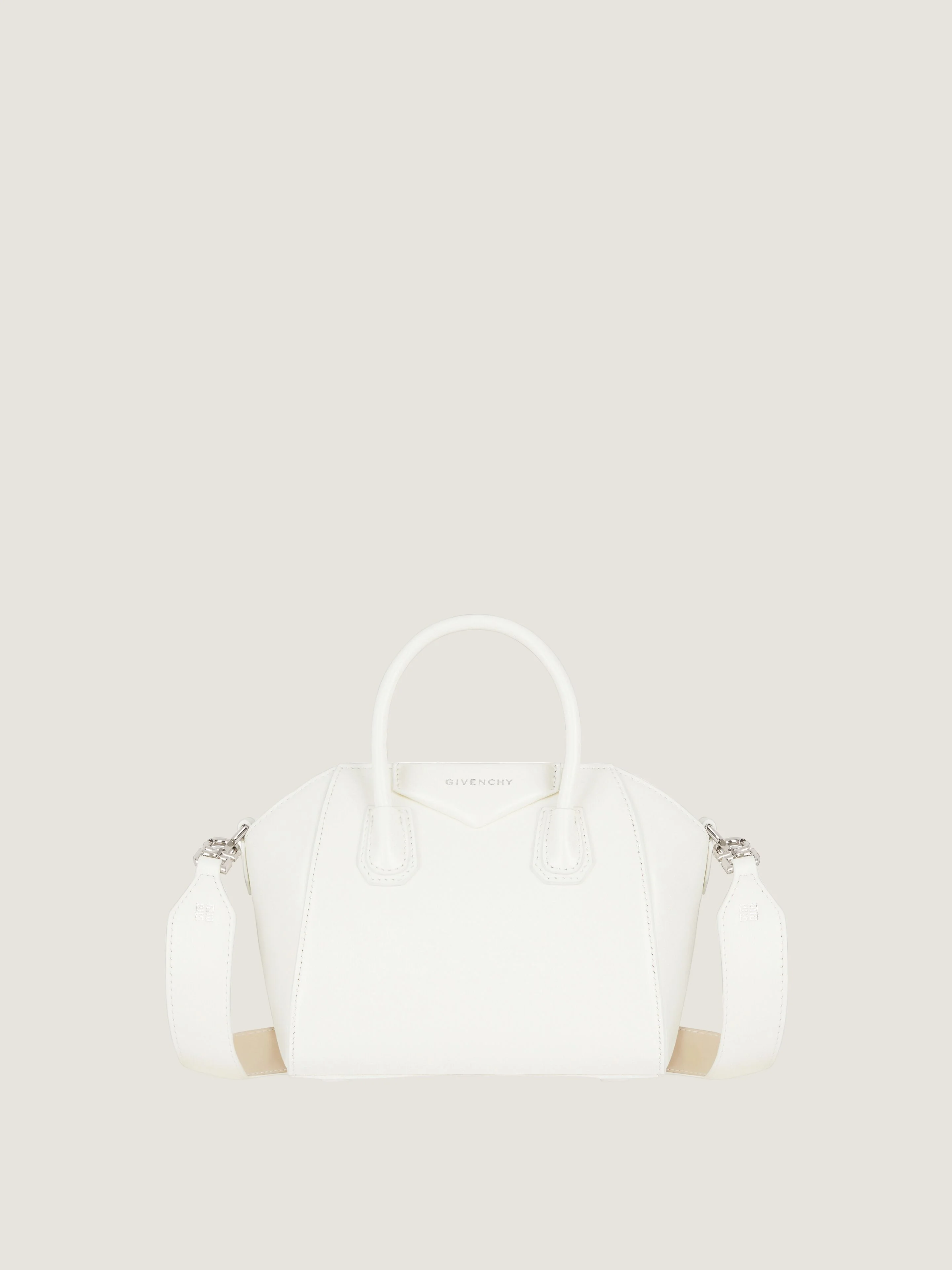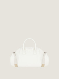 - Mini handbag or crossbody bag in Box calfskin leather. - Antigona Toy line. - Magnetic closure. - Pentagonal patch with embossed GIVENCHY signature. - Large removable bicolor leather shoulder strap with embossed GIVENCHY signature on the top and 4G emblems on the ends. - Silvery-finish metal details. - One main compartment and one inside flat pocket. - Contrasting lining. - Handle : 5.5 in.