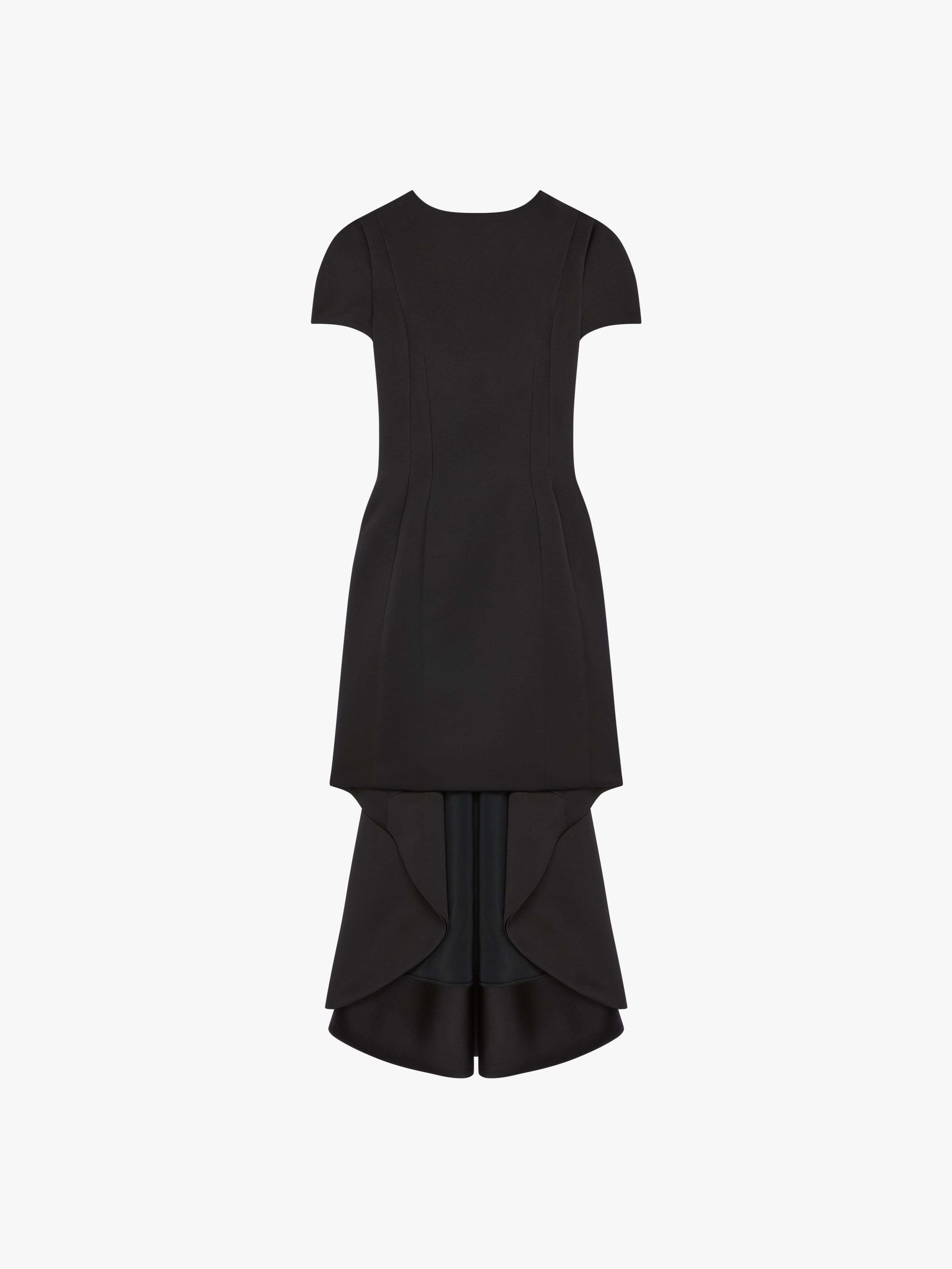 - Short-sleeved dress in satin. - Boat neckline. - Open back with fancy crystals embroidery. - Asymmetric length: short on the front and long voluminous back. - Invisible zipped closure on the side.