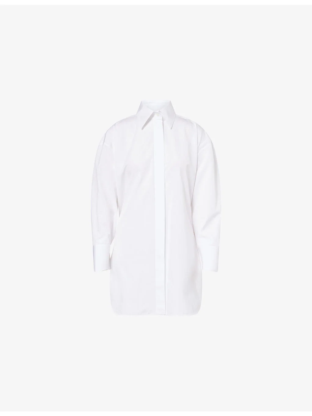 PRODUCT DETAILS - Givenchy cotton shirt - 100% cotton - Button fastening - Relaxed fit, classic collar, long sleeves, buttoned cuffs, covered button placket, curved hem, asymmetric lengths, cropped-cut back - Machine wash at 30°C - Made in Italy - True to size - Model is 5ft 10in/1.78m and wears a size UK 8 - Lightweight, non-stretch Ref: R04557389