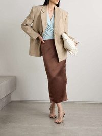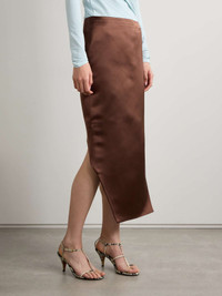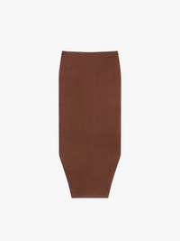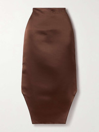 - Long skirt in silk satin duchesse. - Asymmetrical length: long with cut-outs on the front, short on the back. - Invisible zipped closure on the side. - One fake pocket on the front. - Fitted cut. - Model measures 69.7 in and wears a size 36.