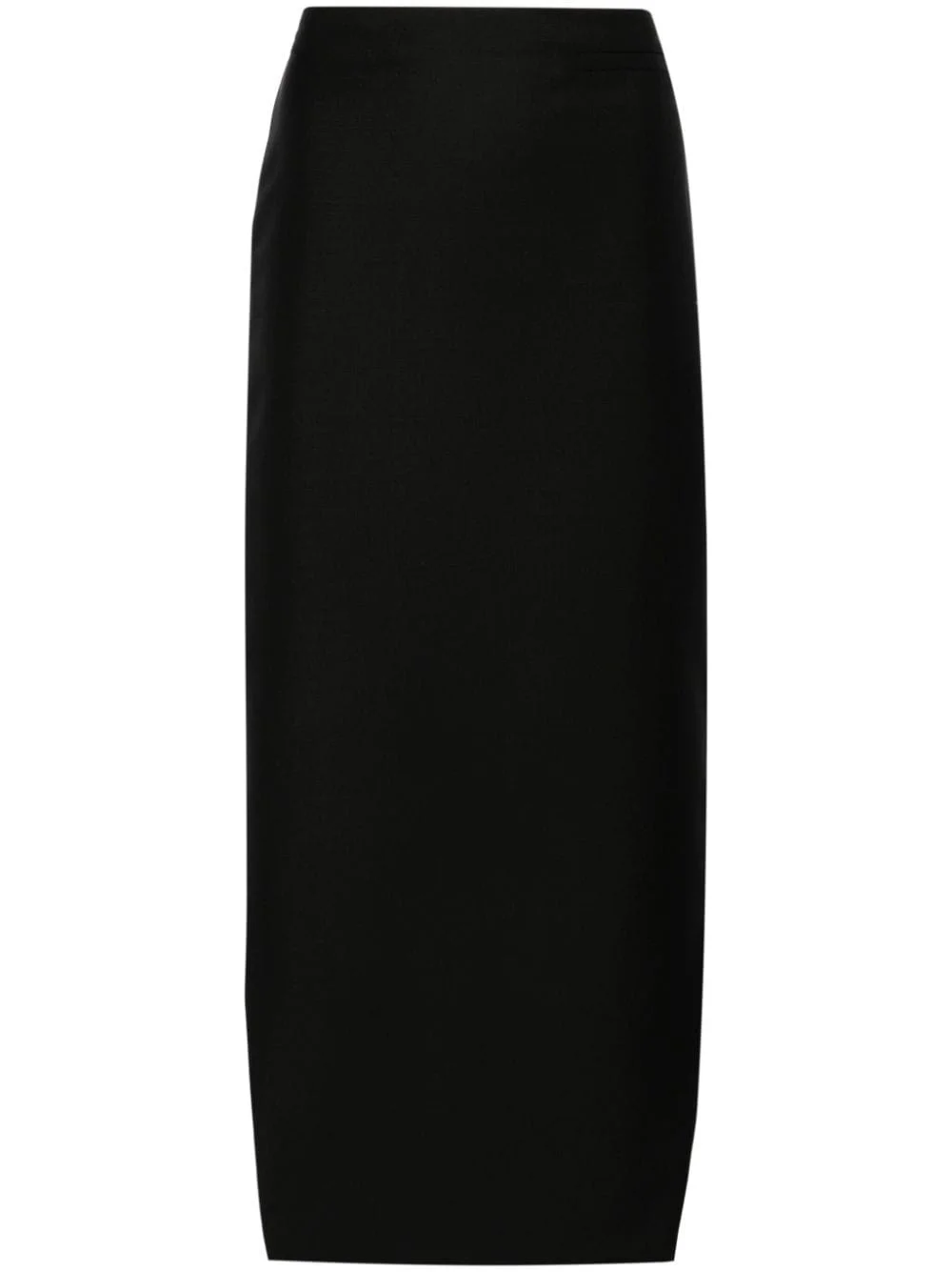 - Long skirt in wool and mohair. - Asymmetrical length: long with cut-outs on the front, short on the back. - Invisible zipped closure on the side. - One fake pocket on the front. - Fitted cut. - Model measures 69.7 in and wears a size 36.