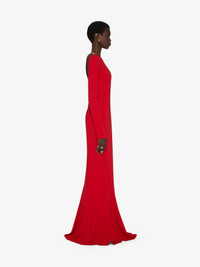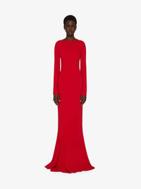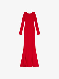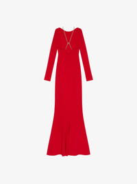 - Long dress with open back neckline and crossed G Link chain straps in silver finishing. - Round collar and long sleeves. - Fitted cut with flared bottom.