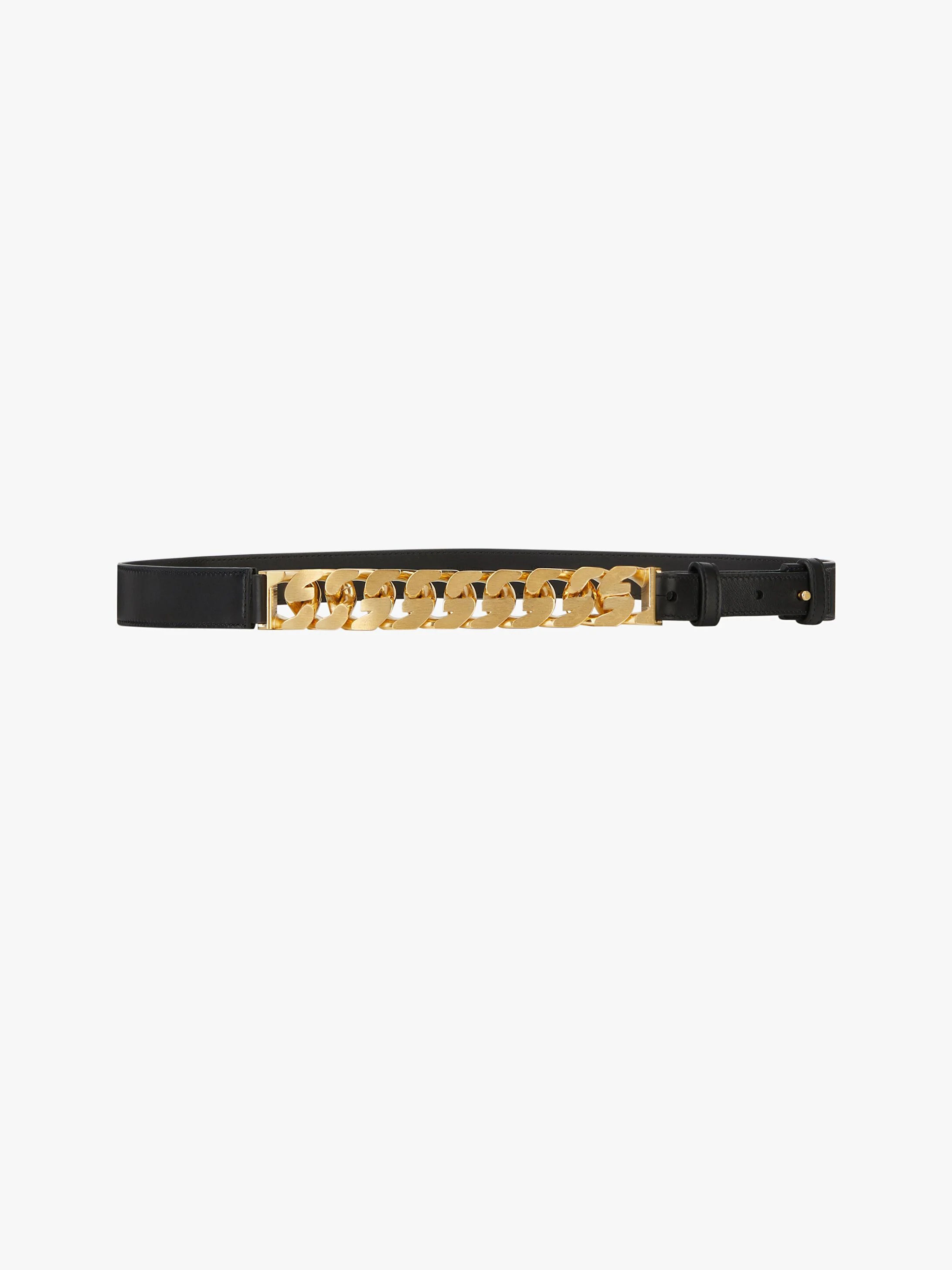 - Belt in smooth calfskin leather. - Color: black. - Insert featuring a G link-chain in gold-finish polished and brushed metal on the front. - Calfskin leather lining.