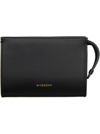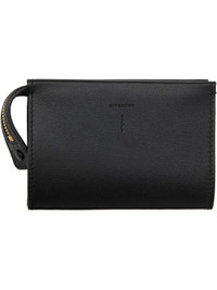 Grained calfskin card holder. · Logo stamp at face · Logo embossed at back face · Zip closure · Two-compartment interior · Two card slots · Central note slot · H3.25" x W4.5" x D1" Supplier color: Black Calfskin. Made in Italy 252278F037000