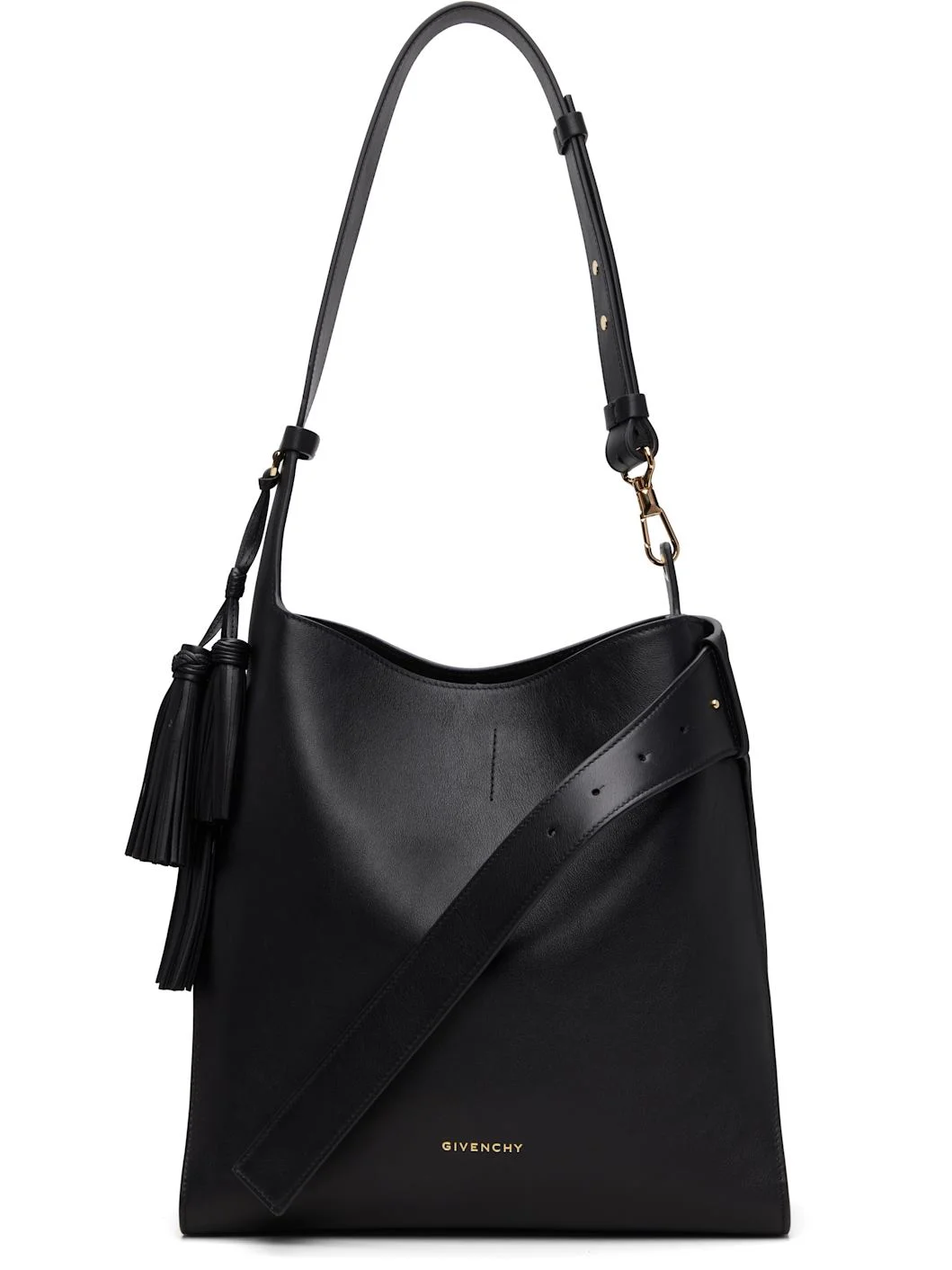 Grained calfskin tote. · Adjustable and semi-detachable shoulder strap · Detachable tassel charm at strap · Logo stamp at face · Integrated post-stud strap at side · Self-tie closure · Patch pocket at interior · Lambskin suede lining · H12.5" x W12.5" x D4.5" Supplier color: Black Body: 100% calfskin. Lining: 100% lambskin. Made in Italy 252278F049000