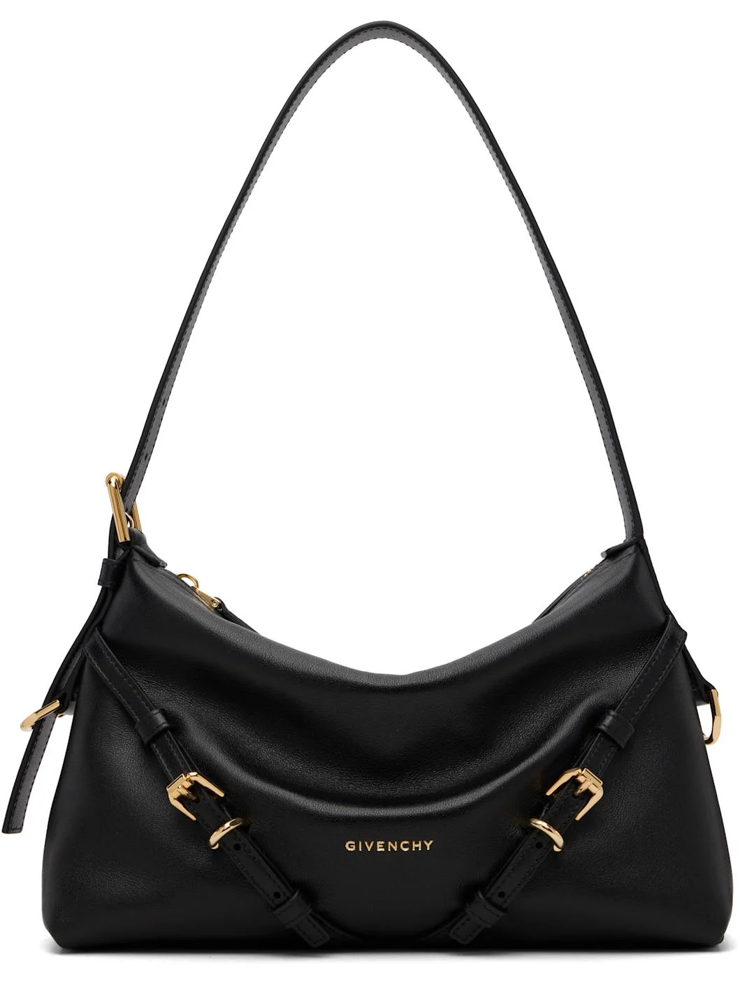 Grained calfskin shoulder bag. · Adjustable shoulder strap · Logo stamp and pin-buckle strap at face · D-ring at sides · Zip closure · Canvas lining · H7.5" x W11" x D3" Supplier color: Black Calfskin. Made in Italy 252278F048010