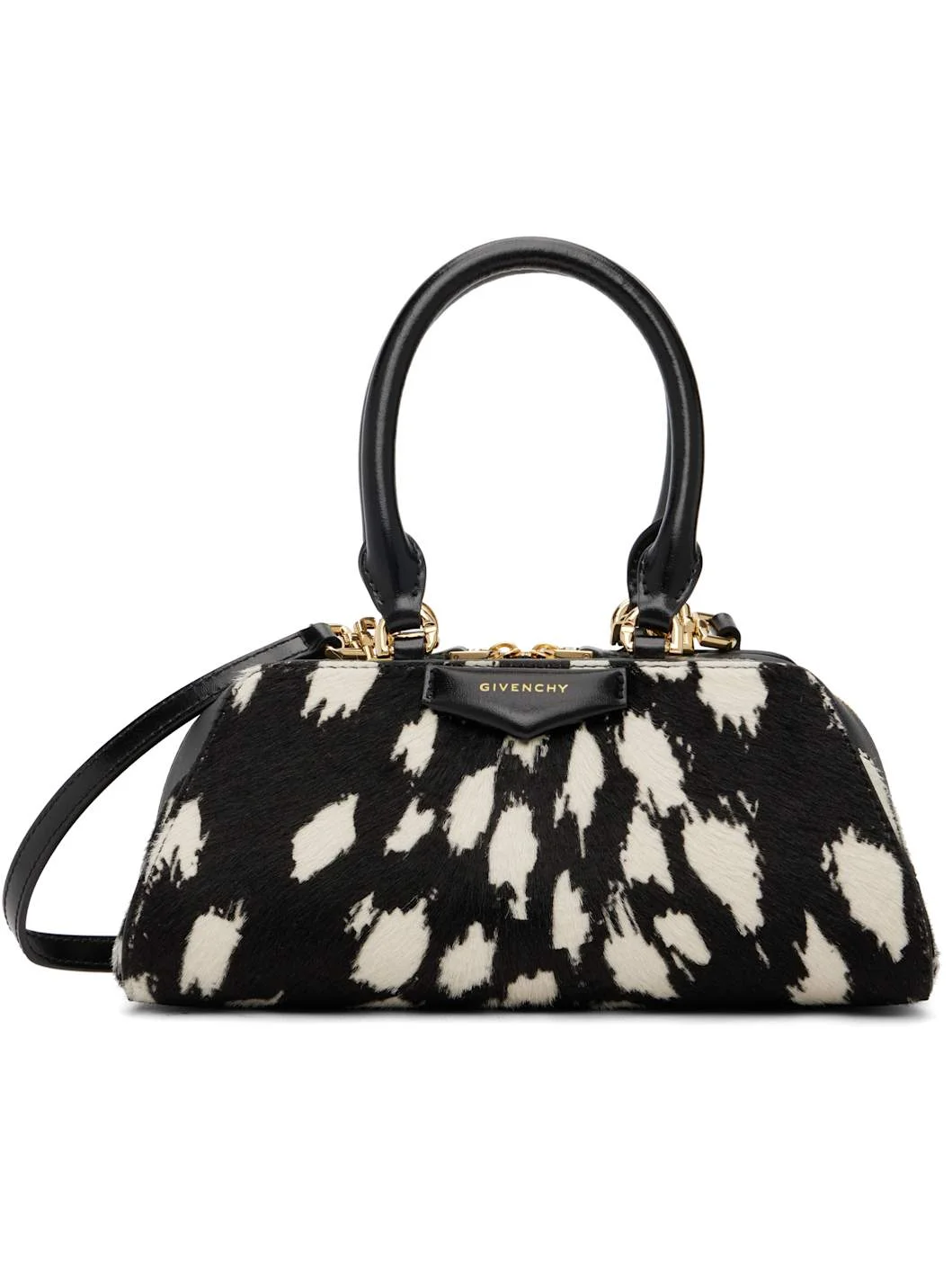 Calf-hair top handle bag. · Graphic pattern printed throughout · Rolled carry handles · Adjustable and detachable crossbody strap · Logo stamp at face · Two-way zip closure · Faille lining · H4.5" x W9" x D4" Supplier color: Black/White Calfskin. Made in Italy 261278F046006