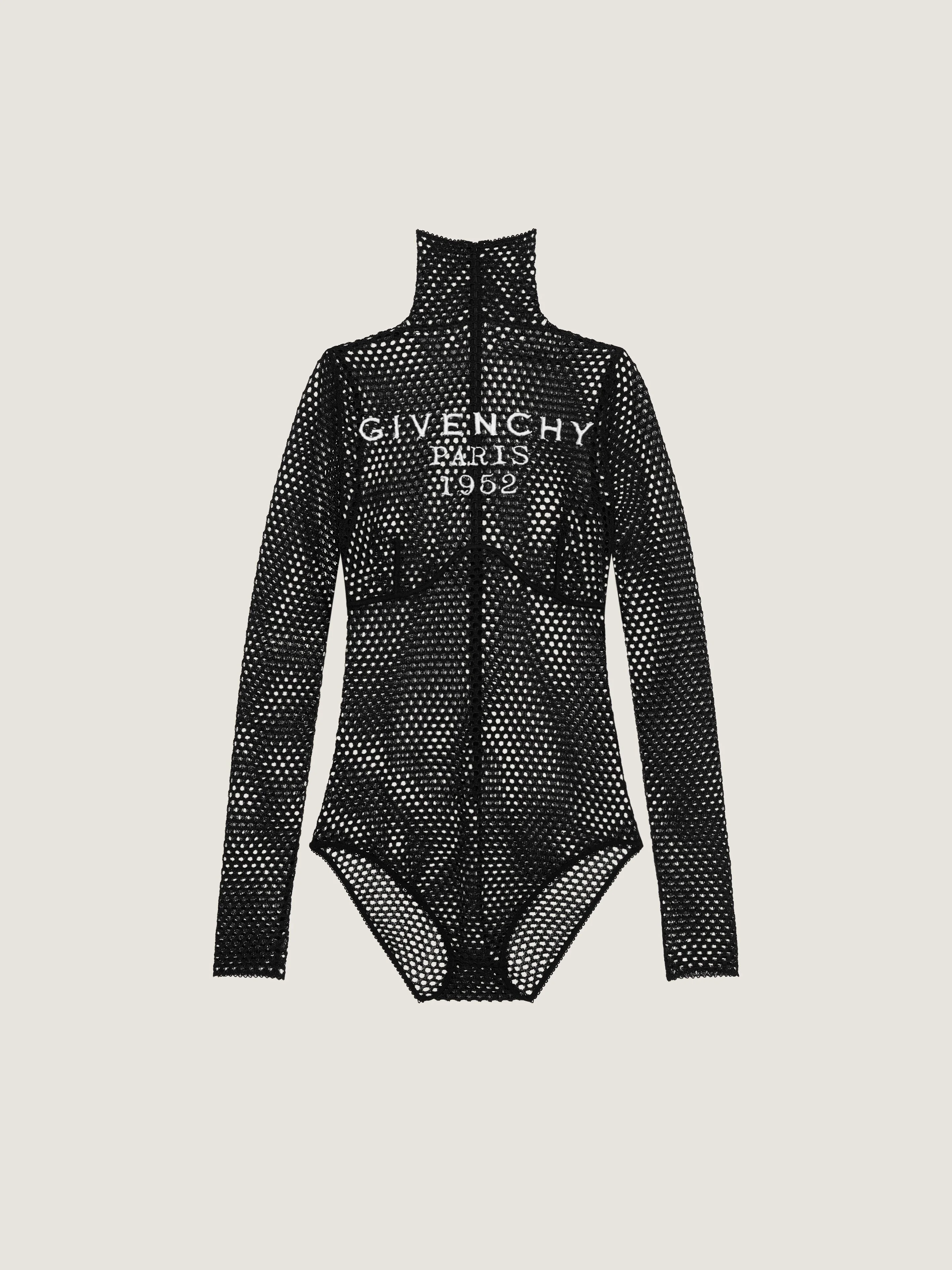 - Long-sleeved knitted bodysuit in mesh. - High neck. - GIVENCHY Paris 1952 signature embroidered on the front. - Invisible zipped closure on the back. - Model measures 5.8 Feet and wears a size S.