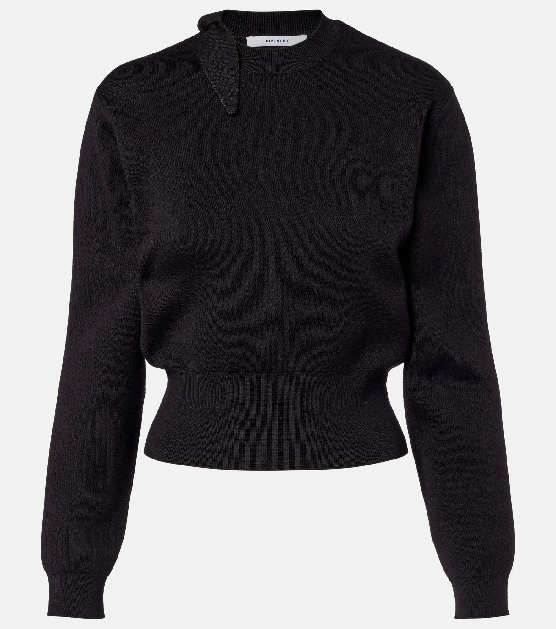 Givenchy's streamlined styles make for timeless wardrobe investments. Knitted from a soft yarn, this sweater is designed with a classic crewneck, puff sleeves, and a detachable bow on the shoulder. Product Details - Material: 44% wool, 42% cotton, 13% polyamide, 1% elastane - Care instructions: dry clean - Made in Italy - Color: black - Designer color name: Black - Cuff: ribbed - Hem: ribbed - Item number: P01124979 Size & Fit - True to size - Cinched waist - Elasticated hem - Slightly cropped - The model seen in the picture is 178cm-5'10" and wearing a size XS