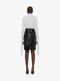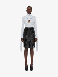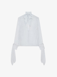 - The bow, a key design element by Hubert de Givenchy, is reinterpreted this season. Adding a touch of romance to his collections, the bow continues to embody the House's timeless elegance and sophisticated charm. - Long-sleeved blouse in crepe with satin back. - V neck with double lavalliere. - Monogram 72 jacquard. - Double bow to tie at the cuffs. - Classic fit. - Model measures 5.8 Feet and wears a size 36.