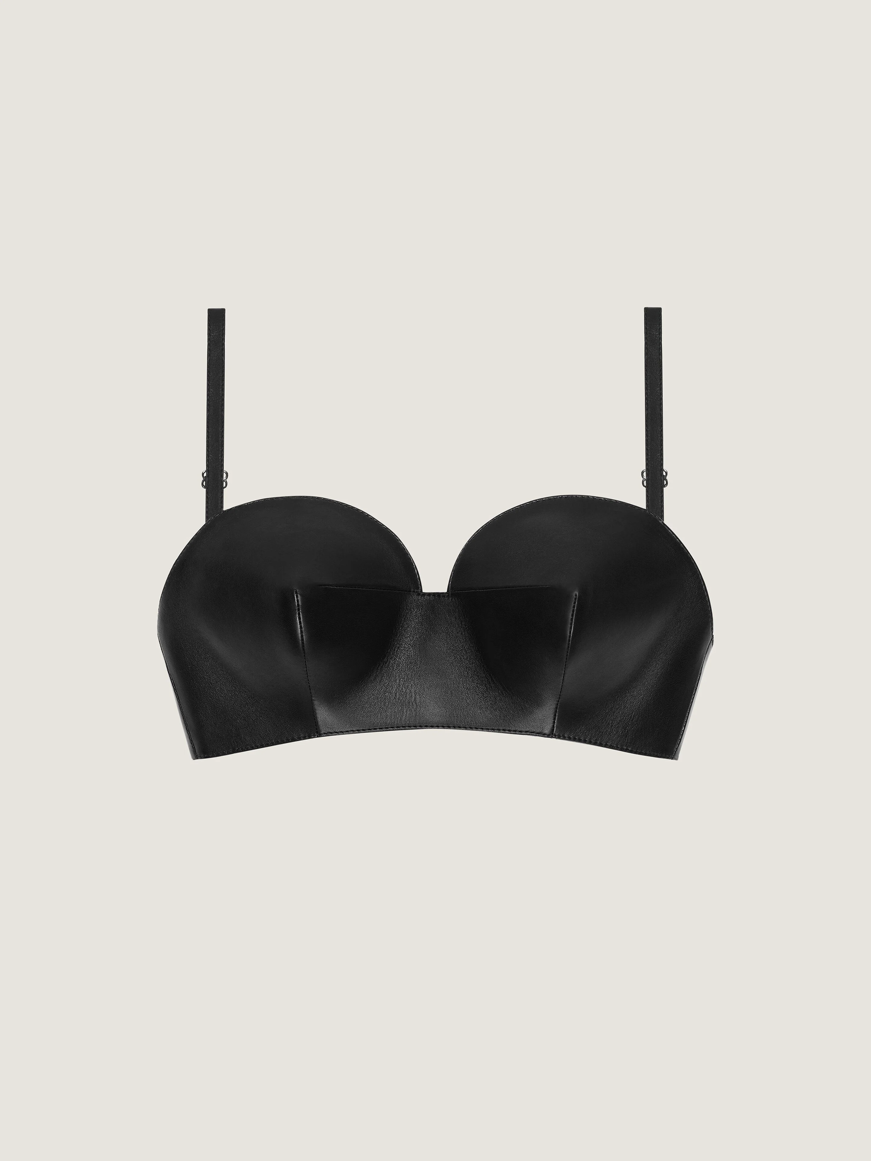 - Bullet bra top in plonge lambskin. - Adjustable straps. - Hook closure on the back. - Model measures 5.8 Feet and wears a size 36.