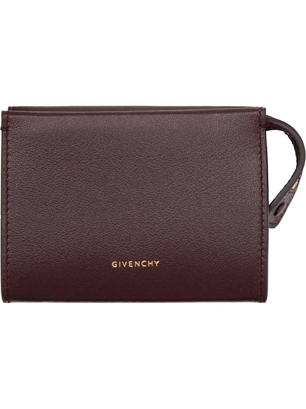 Grained calfskin card holder. · Logo stamp at face · Logo embossed at back face · Zip closure · Two-compartment interior · Two card slots · Central note slot · H3.25" x W4.5" x D1" Supplier color: Burgundy Calfskin. Made in Italy 252278F037001