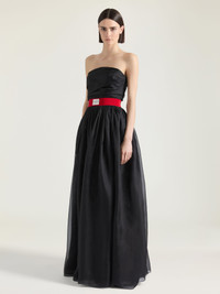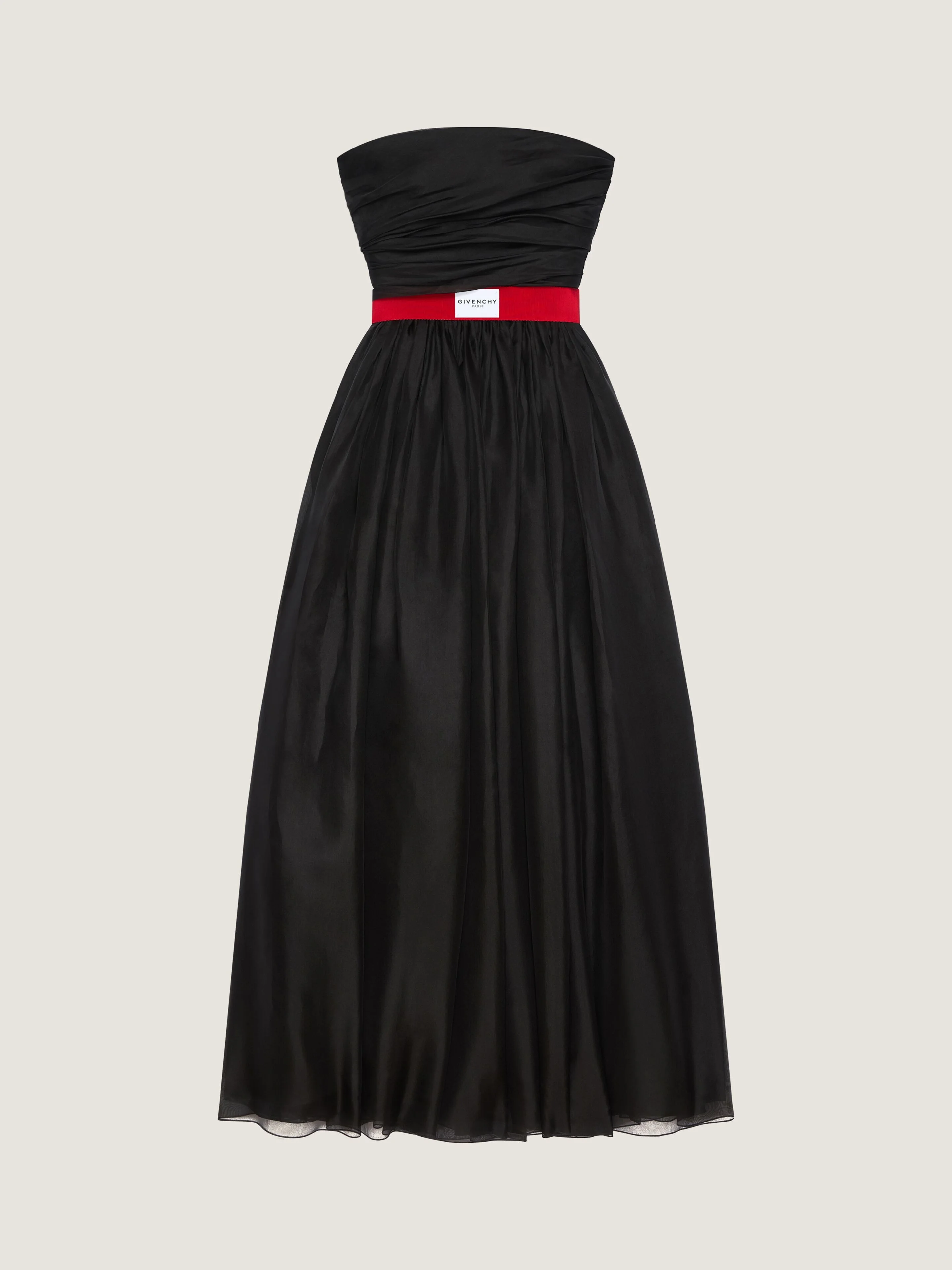 - Long strapless evening dress in organza. - Draped. - Integrated corset. - Non removable gros grain belt with embroidered GIVENCHY label. - Invisible zipped closure on the side. - Model measures 5.8 Feet and wears a size 36.