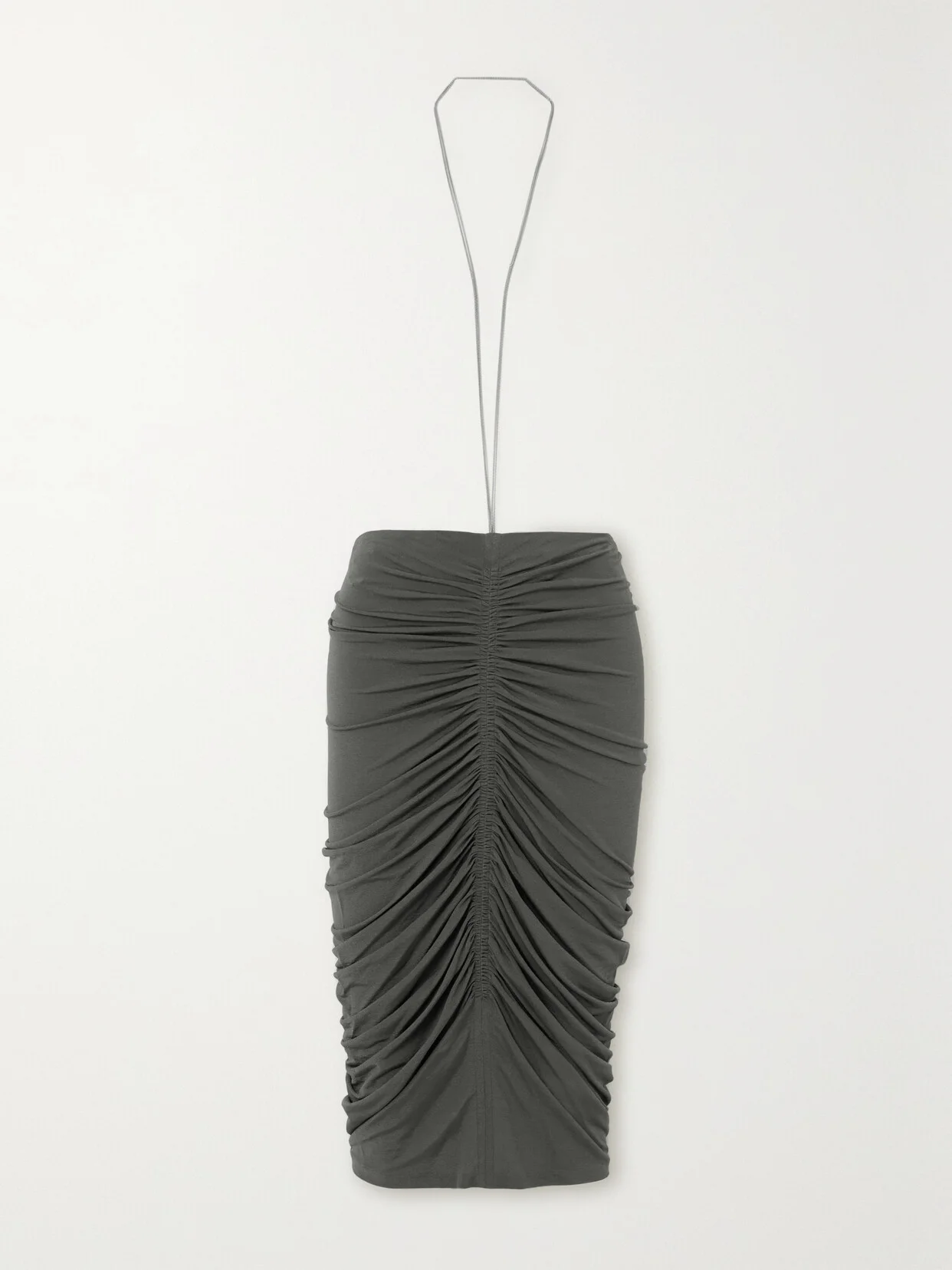 Givenchy's skirt debuted on the Spring '23 runway, where it was styled minimally with a slick bralette to keep the chain strap on full display. It's made from stretch-jersey and is ruched through the front and back. Wear yours like the model did or slip the necklace-inspired embellishment over a slim-fitting tank.