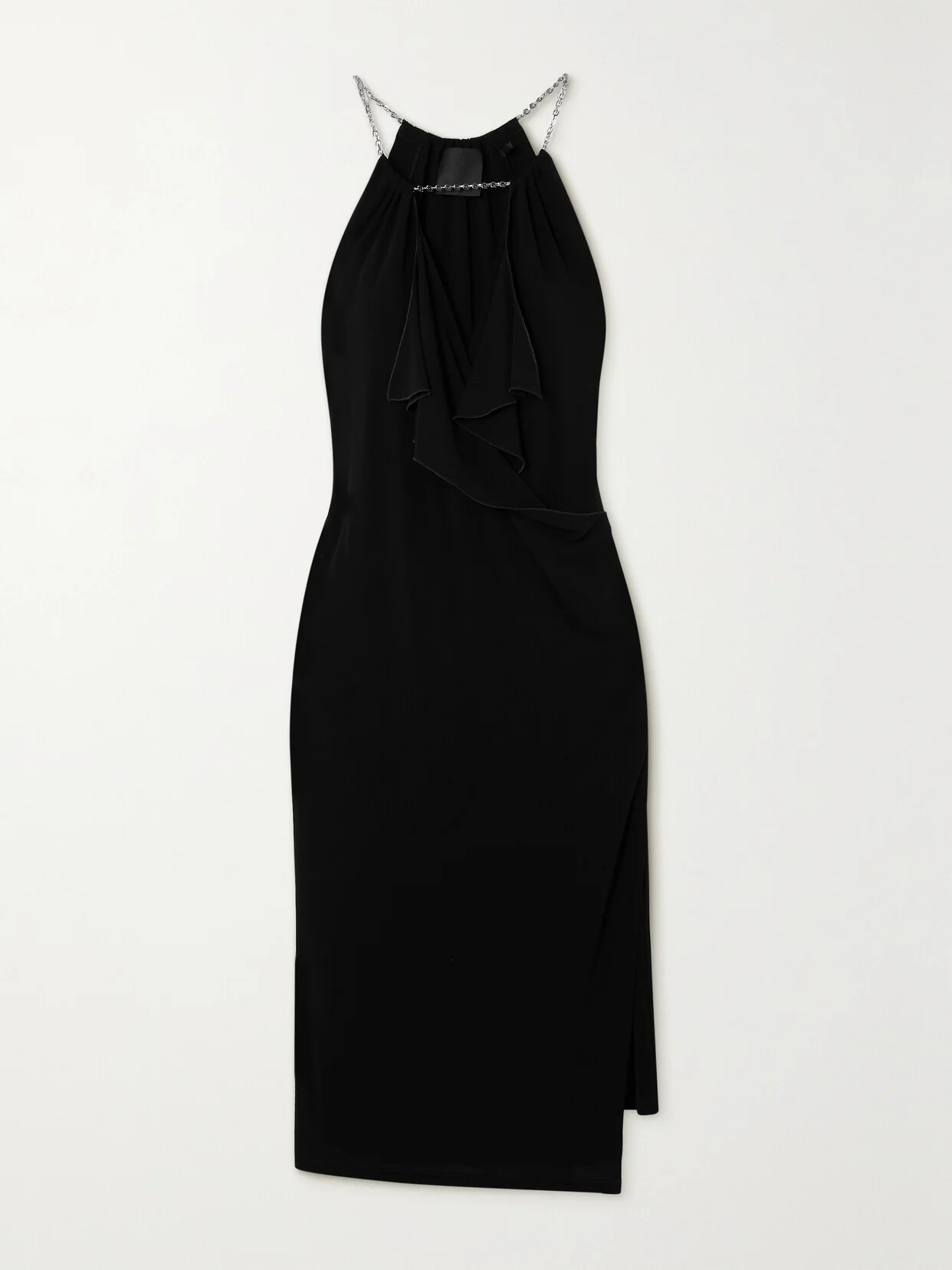 Givenchy's midi dress is sure to make a lasting impression. Part of the Resort '24 collection, it's made from black crepe de chine and has an alluring cutout at the neckline that's framed with cascading ruffles. Match your accessories to the slinky chain strap.
