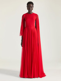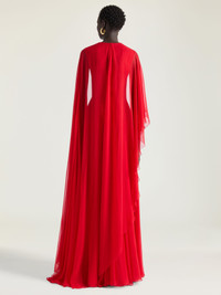 - Long draped evening dress in silk chiffon. - Crew neck. - Asymmetric sleeves. - Matching cape on the back. - Invisible zipped closure on the back. - Opaque lining.