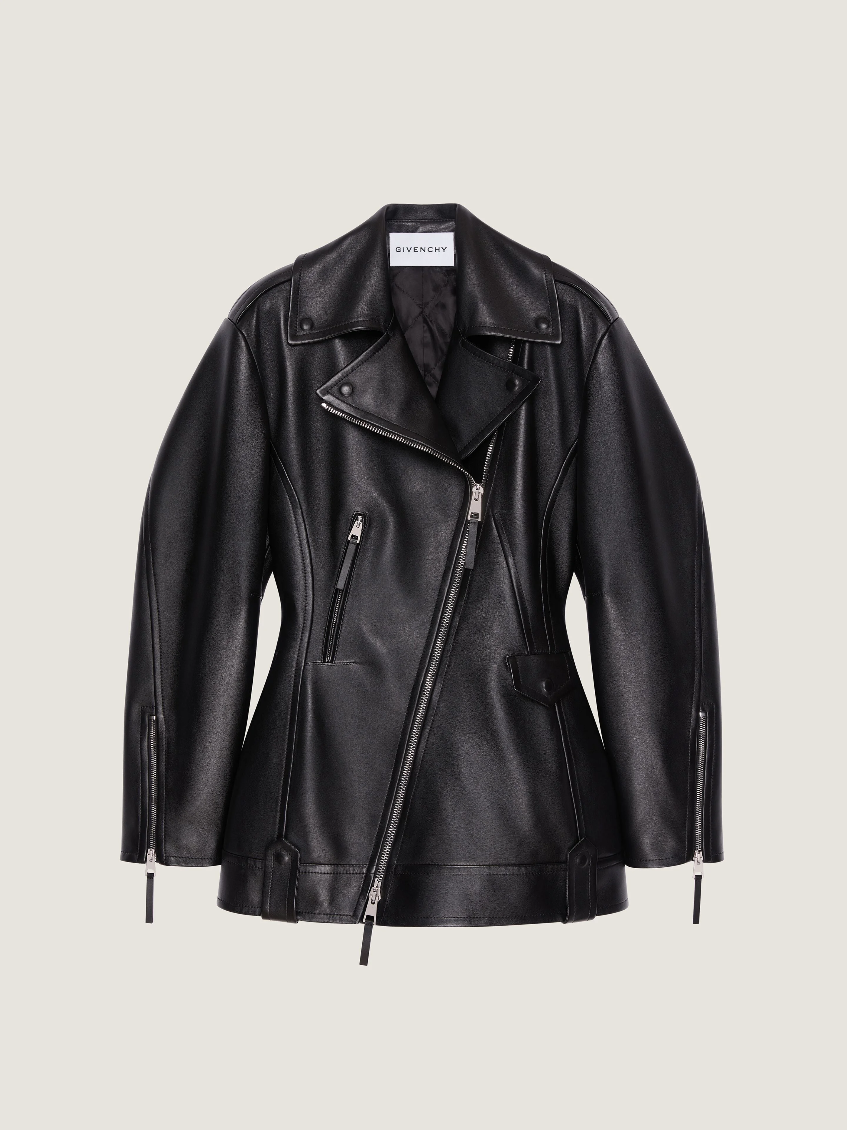 - Jacket in leather. - Zipped closure on bias. - One zipped pocket on the right side and one flap pocket on the left side. - Metal zippers on the cuffs. - Cinched waist. - Bias seams for a cocooning volume. - Model measures 5.8 Feet and wears a size 36.