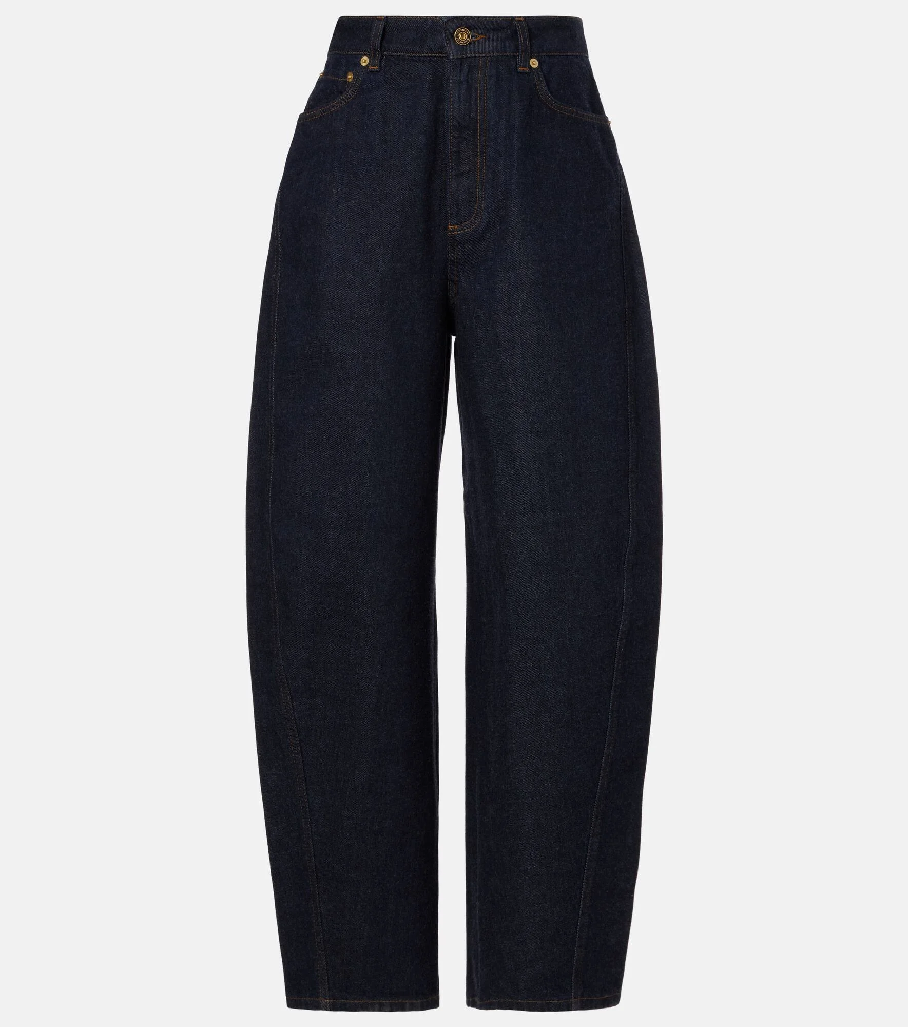 The Cocoon wide-leg jeans from Givenchy are crafted with bias seams for added volume and feature a flattering high-rise fit. The timeless design is complete with an embossed leather patch at the back for a signature touch. Product Details - Material: 100% cotton - Care instructions: machine wash at 30 degrees - Made in Romania - Designer color name: Dark Blue - Item color: blue - Dye: dark - Closure: zip and button fastening - Pockets: five pockets - Belt loops - Item number: P01080826 Size & Fit - Fits small to size - we recommend trying one size larger - Non-stretchy fabric - Wide-leg - High-rise - The model seen in the picture is 178cm-5'10" and wearing a size 27
