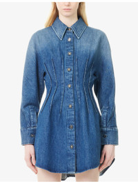 PRODUCT DETAILS - Givenchy denim mini dress - 100% cotton - Exposed button fastenings at front - Regular fit, pointed collar, dropped shoulders, long sleeves, buttoned cuffs, branded silver-toned hardware, pleats at front and back, inverted seams, brand patch at back, curved hem, cocoon silhouette, mini length - Machine wash at 30°C - Made in Romania - True to size - Size UK 8: length 32in / 81.5cm - Model is 5ft 10in/1.78m and wears a size UK 8 - Midweight, non-stretch Ref: R04557353