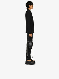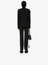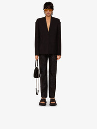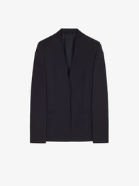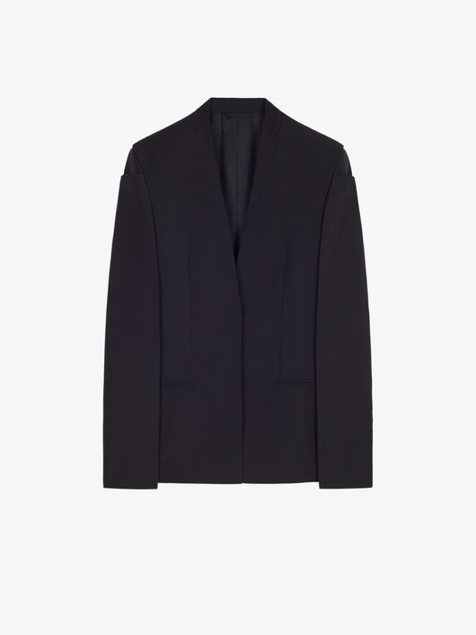 DETAILS - Collarless tailored jacket in wool and mohair. - Color: black. - Shoulders with glove-effect graphic structure. - Fitted cut. - Invisible one-button closure. - Two welt pockets on the sides. - Composition: 73% wool, 27% mohair. - Country of origin: Italy. - Dry clean recommended - Iron at maximum soleplate temperature (110°C) without steam - Do not tumble dry - Do not bleach - Product code: - BW30CU13QB-001