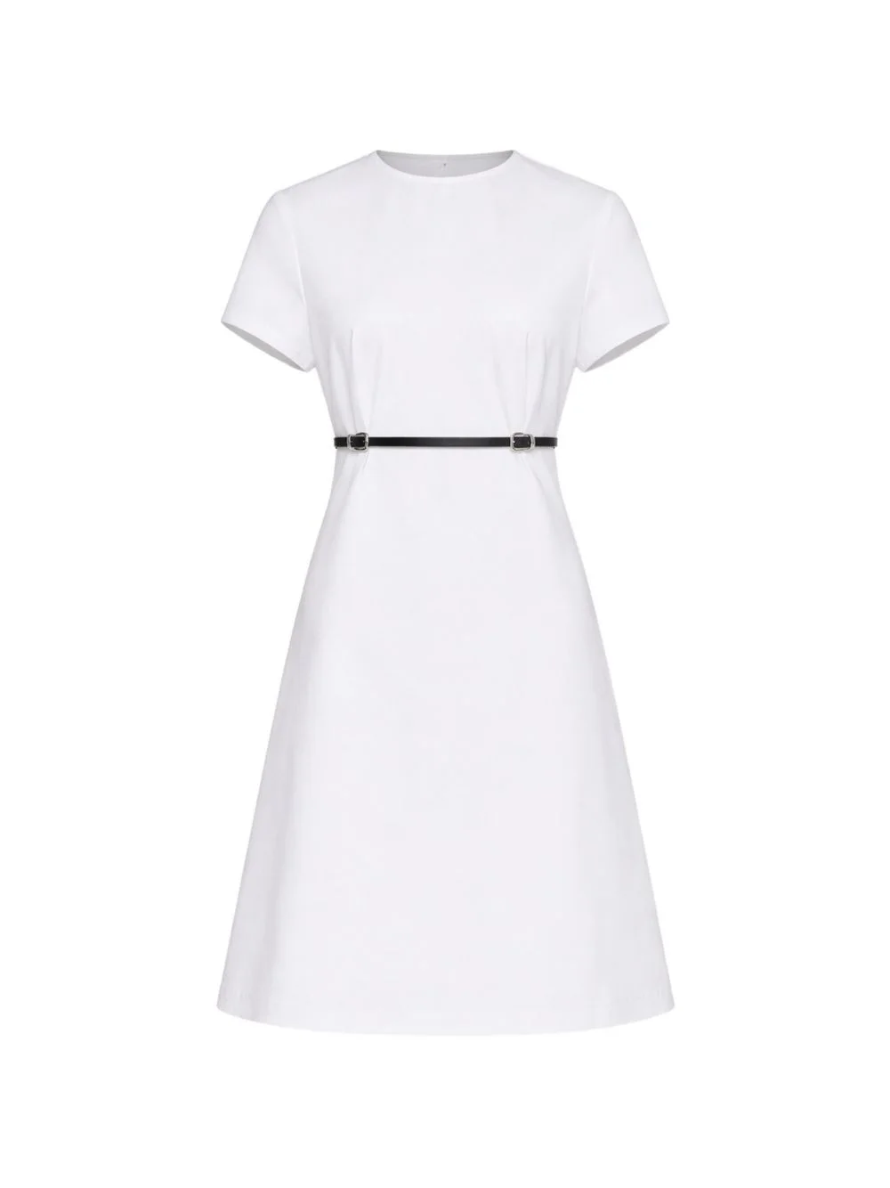 crew-neck midi dress Highlights - White - Belt waist - Round neck - Short sleeves - A-line Imported Composition Fabric 100% Washing instructions Read Manufacturer Guidelines