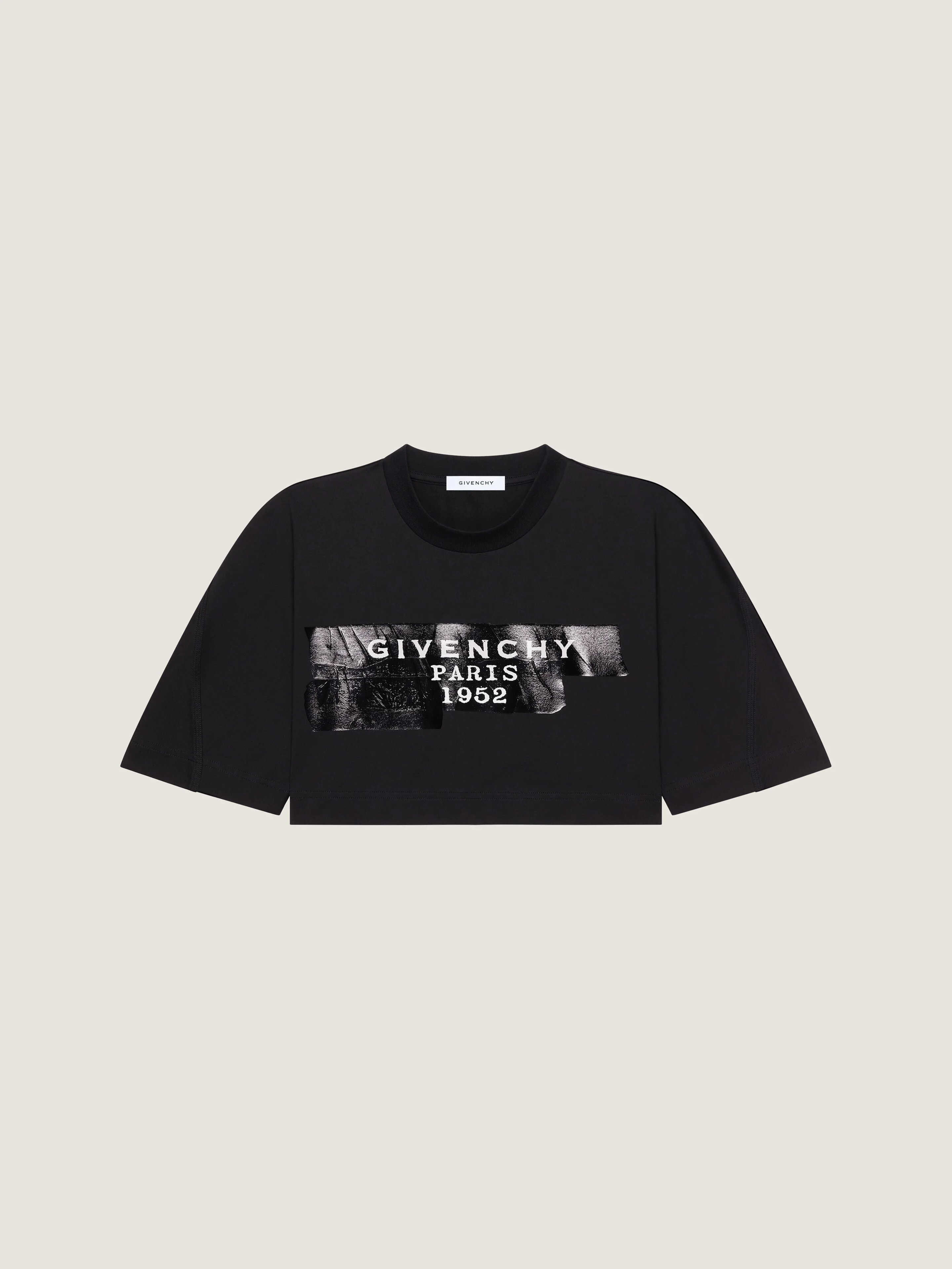 - Short-sleeved t-shirt in cotton. - Crew neck. - GIVENCHY Tape 3D print on the front. - Cropped fit. - Model measures 5.8 Feet and wears a size XS.