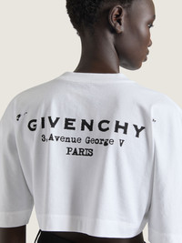- Short-sleeved t-shirt in cotton. - Crew neck. - GIVENCHY Stamp printed on the chest and on the back. - Bias seams for a cocooning volume. - Cropped fit.