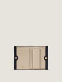 - Wallet in grained calfskin leather. - Day line. - Press-button closure. - Golden GIVENCHY signature on the front. - Embossed GIVENCHY Paris signature on the back. - Golden GIVENCHY signature on the inside. - Leather-covered button on the front. - One coin pocket with press stud. - One flat bill pocket and five card slots. - Contrasted interior.