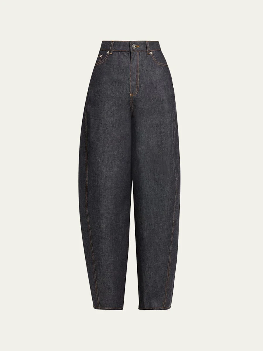 Givenchy pants are crafted from dark washed denim in a curved cocoon silhouette High rise Fivepocket style Barrel legs Full length Button/zip fly; belt loops Cotton Made in Romania