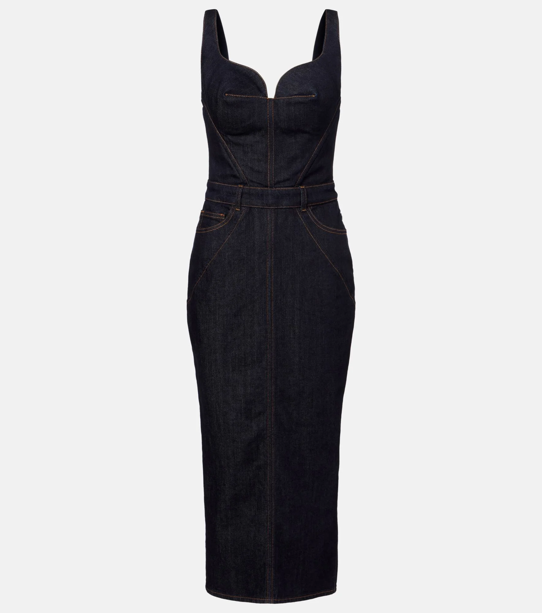 Discover Givenchy's considered cuts, sharp tailoring, and exquisite craftsmanship. Made in Italy from dark-washed denim, this dress features a bustier bodice, a fitted silhouette, and a kickback detail at the back. Product Details - Material: 98% cotton, 2% elastane - Care instructions: dry clean - Made in Italy - Color: blue - Designer color name: Dark Blue - Lining: 65% polyester, 35% cotton - Padded cups - Pockets: five pockets - Closure: concealed zipped back - Item number: P01124935 Size & Fit - True to size - Fitted - Non-stretchy fabric - Padded top - The model seen in the picture is 178cm-5'10" and wearing a size FR 36