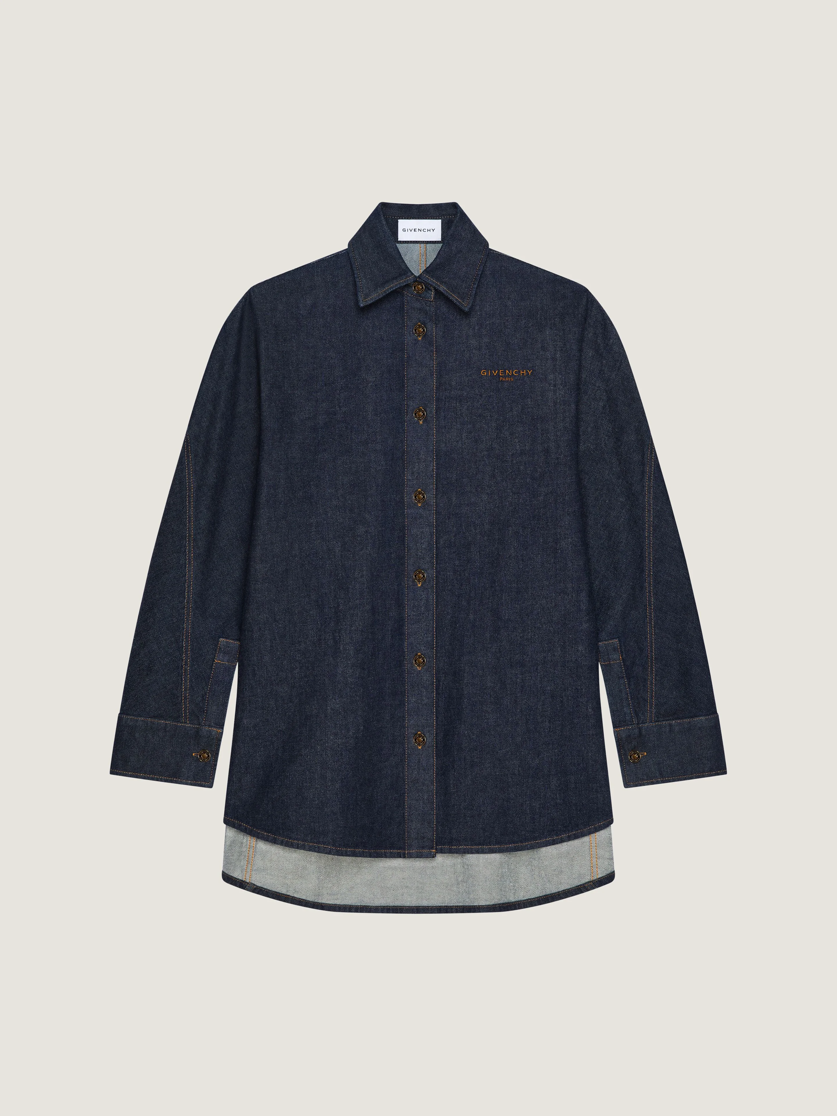 - Long-sleeved shirt in denim. - Classic collar. - Small GIVENCHY Paris signature embroidered on the chest. - GIVENCHY embossed leather patch on the back. - Button closure. - Buttoned cuffs. - GIVENCHY engraved buttons. - Bias seams for a cocooning volume. - Model measures 5.8 Feet and wears a size 36.