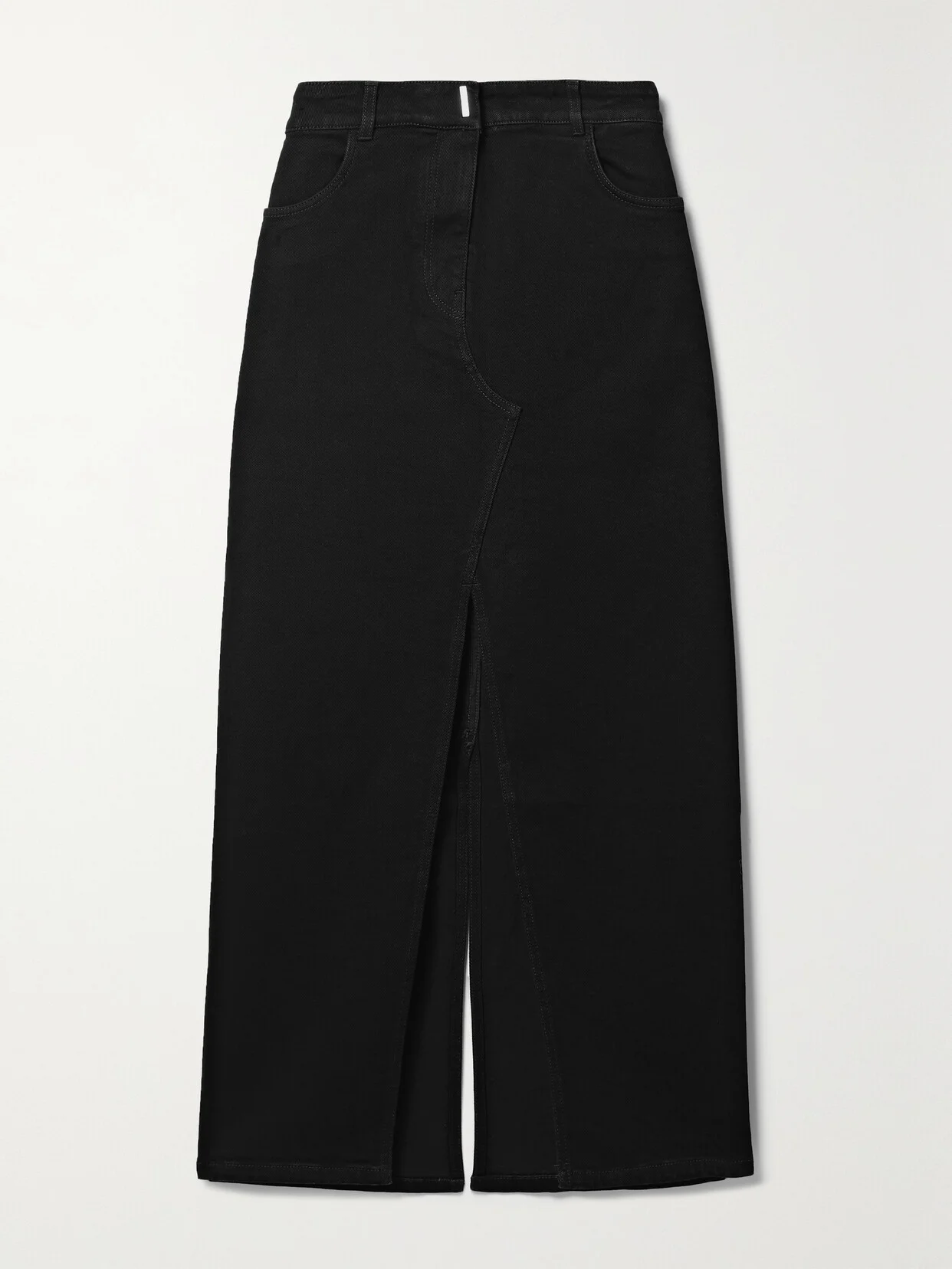 Givenchy's denim midi skirt has a dramatic split at the front that's perfect for showing off a fabulous pair of knee boots. Made from black denim and woven with a hint of stretch, it has a sleek paneled construction and a high-rise waistband.