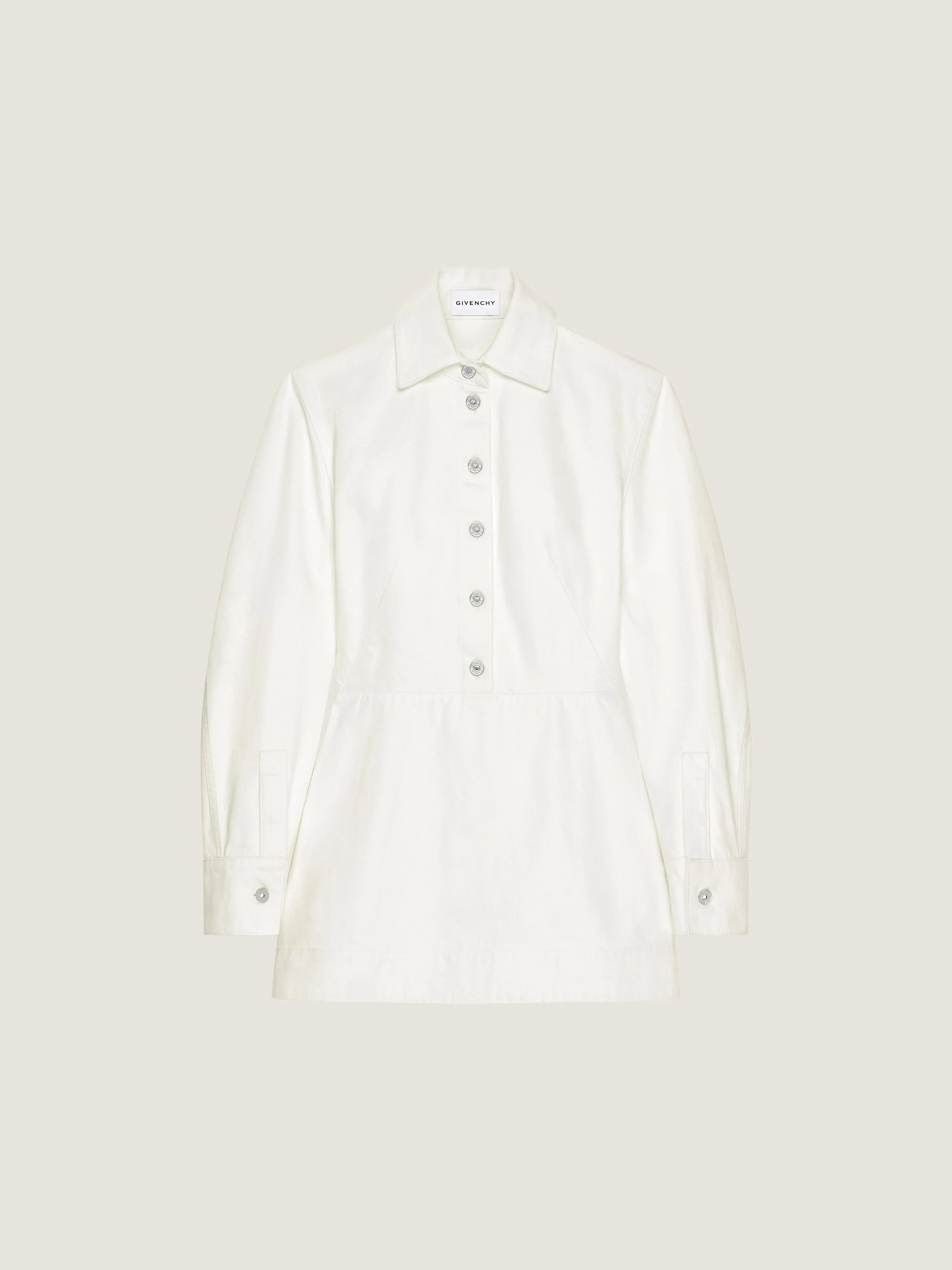 - Mini dress with long sleeves in white denim. - Classic collar. - Patch in denim with GIVENCHY Paris 1952 on the upper back. - Button closure. - Buttoned cuffs. - GIVENCHY engraved silvery buttons. - Couture seams for a cocooning volume and cinched waist. - Model measures 5.8 Feet and wears a size 36.