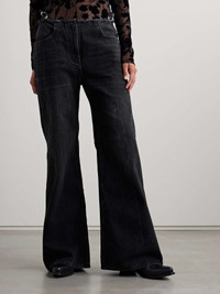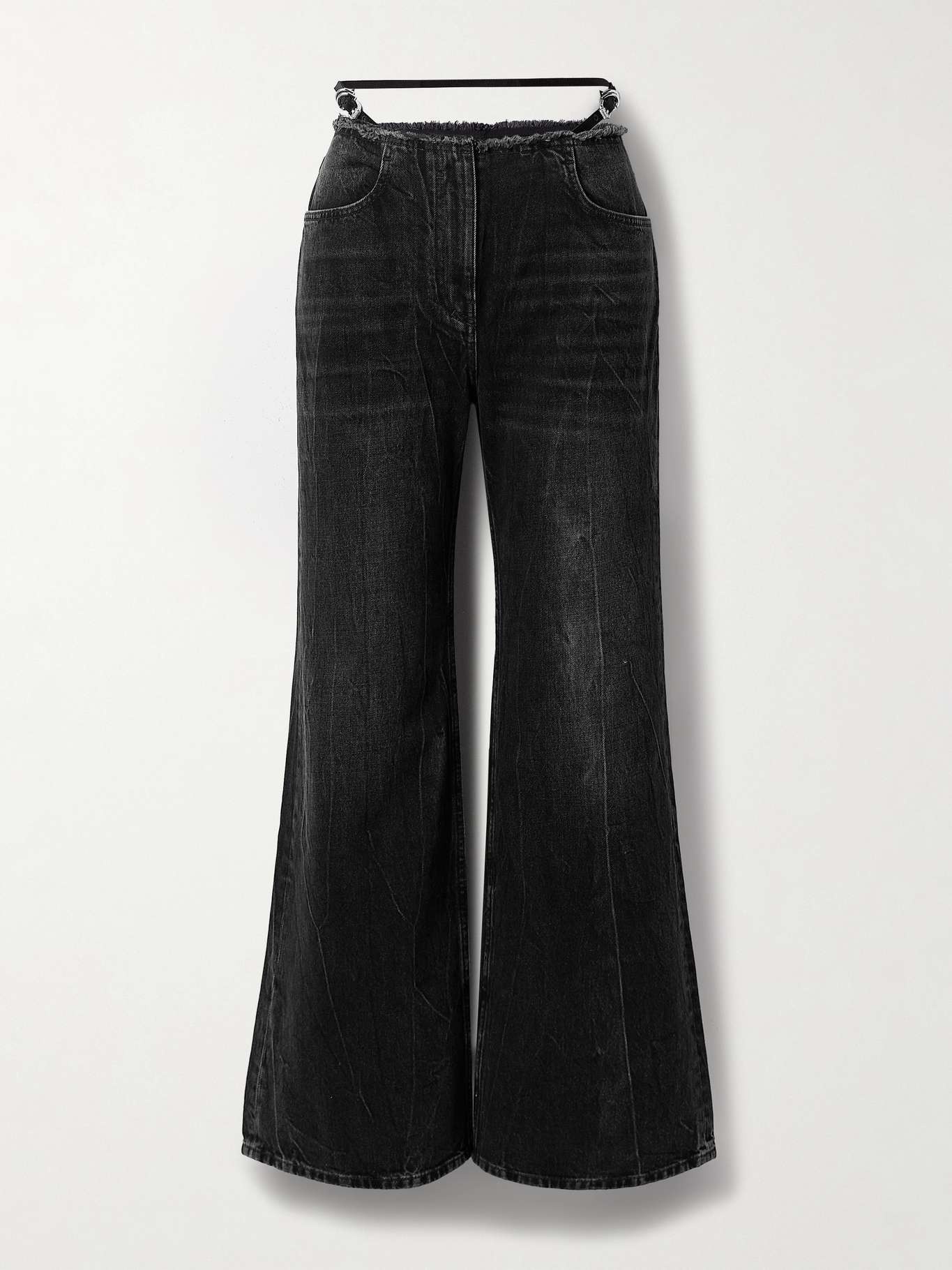In place of a traditional waistband, Givenchy's low-rise jeans have frayed edges and adjustable buckled straps that hug your hips. They're cut from washed black denim and have baggy, wide legs. Style yours with a tucked-in or cropped top to showcase the details. Size & Fit - Fits true to size, take your normal size - Low-rise, cut for a wide-leg fit - Mid-weight, non-stretchy fabric - Model is 175cm/ 5'9" and is wearing a size 27 Model measurements: - Bust: 79cm/ 31” - Waist: 61cm/ 24” - Hip: 88cm/ 34.5” Details & Care - Black denim - Concealed button and zip fastening at front - 100% cotton; pocket lining: 65% polyester, 35% cotton - Machine wash