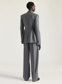 - Structured jacket in wool. - Pointed collar. - Double breasted. - Buttoned cuffs. - One chest pocket. - Two front flap pockets. - Satin lining.