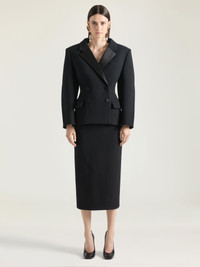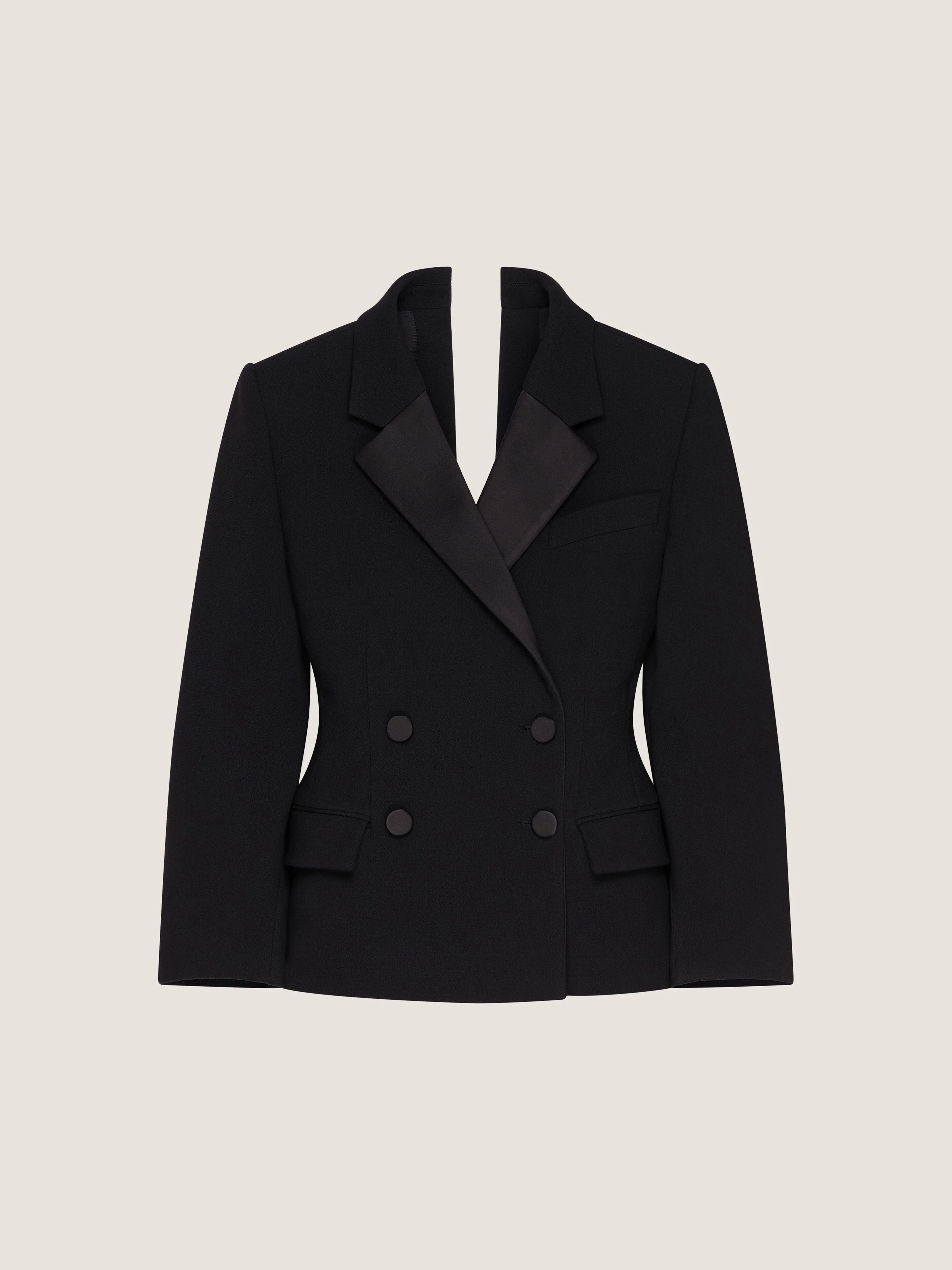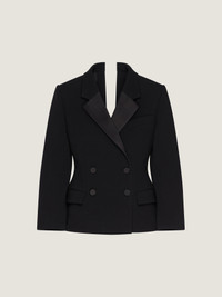 - Tuxedo jacket in wool crepe. - Satin notch lapel. - Sliced back detailing. - Double breasted with satin-covered buttons. - One chest pocket. - Two front flap pockets. - Couture seams for a cocooning volume and cinched waist. - Model measures 5.8 Feet and wears a size 36.