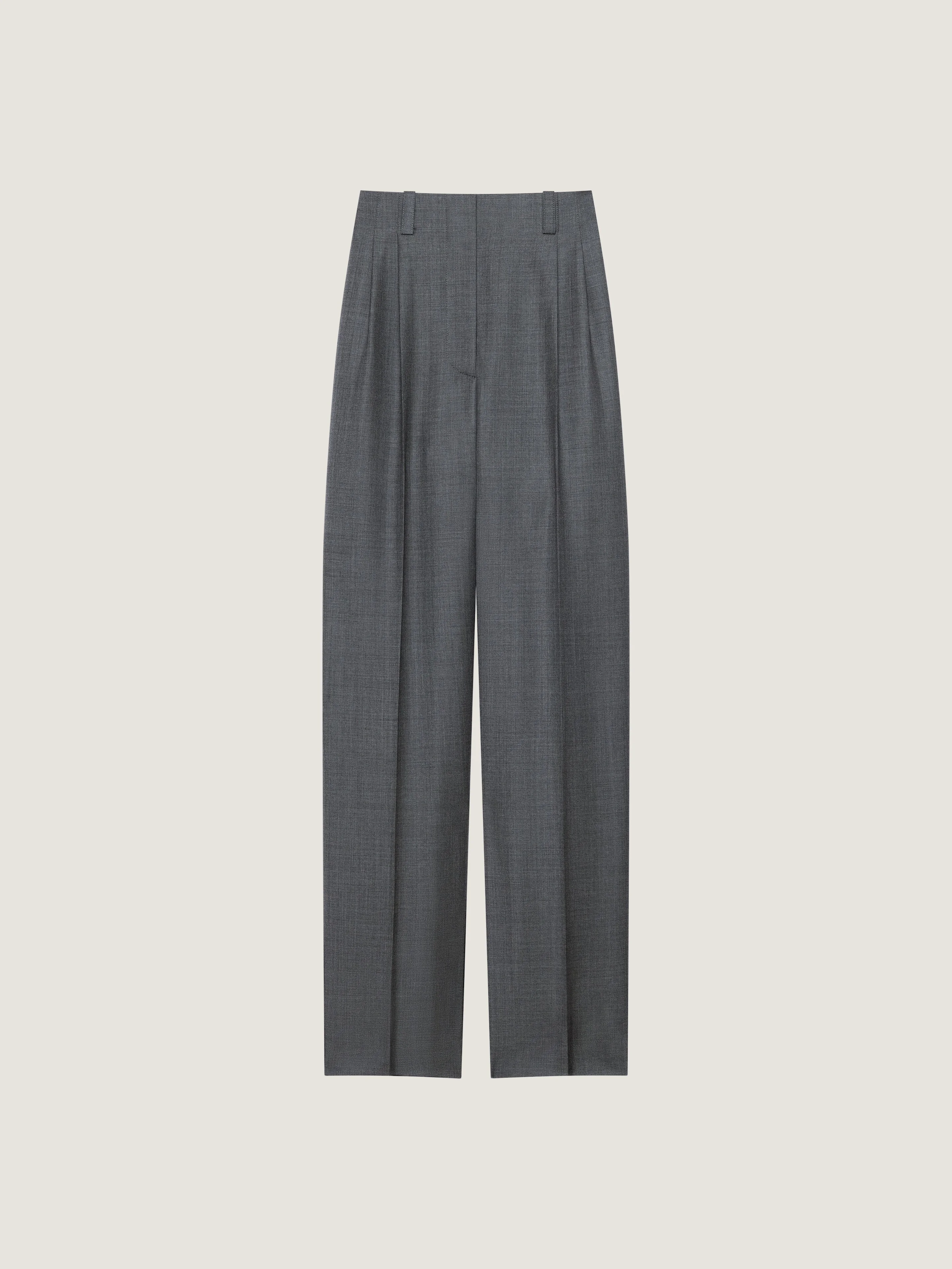 - Double pleat pants in wool. - Low waist and elastic band on the back. - Zipped closure with hook. - Two side pockets. - One back pocket. - Model measures 5.8 Feet and wears a size 36.