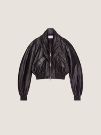 - Bomber in nappa leather. - Shawl collar with double zippers. - Zipped closure. - Two side flap pockets. - Elasticated knitted hem and cuffs. - Bias seams for a cocooning volume. - Model measures 5.8 Feet and wears a size 36.