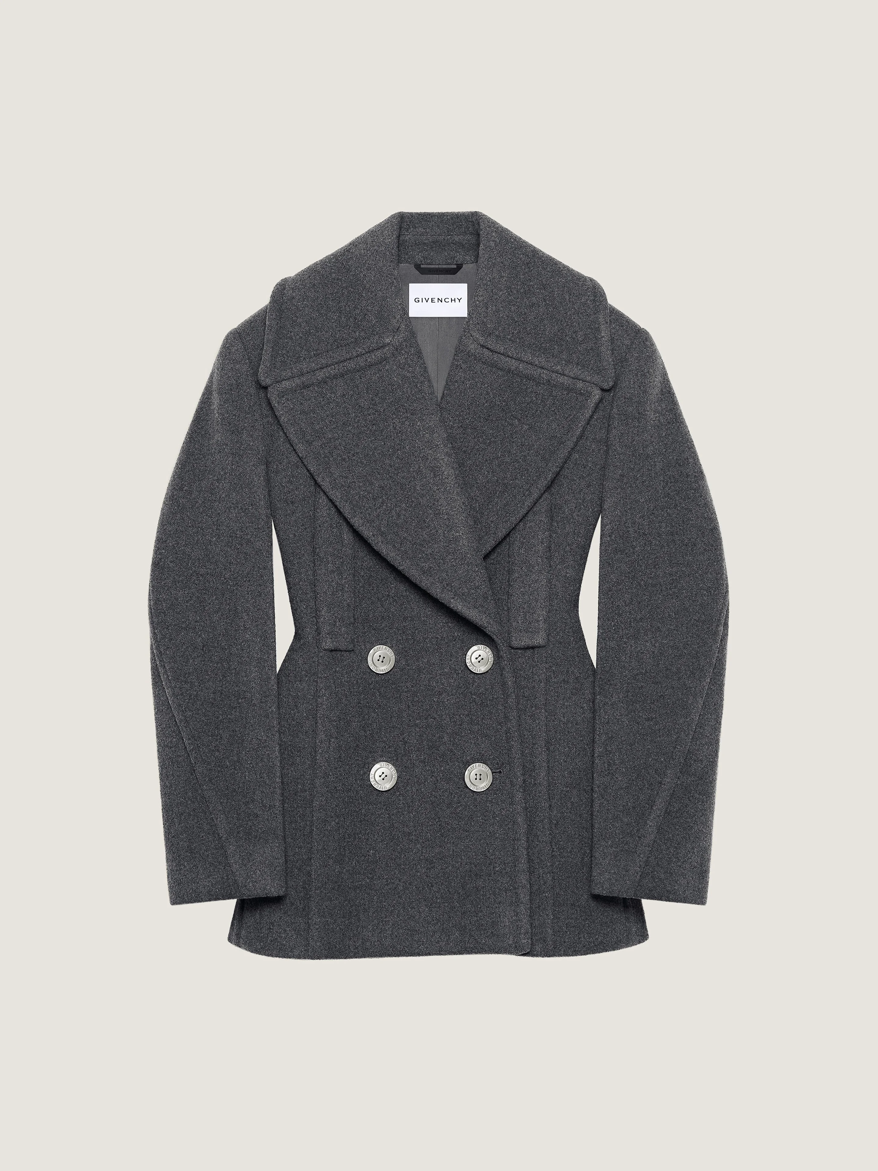- Pea coat in wool melange. - Large notch lapel. - Double breasted. - GIVENCHY engraved silvery buttons. - Two front pockets. - Couture seams for a cocooning volume and cinched waist. - Model measures 5.8 Feet and wears a size 36.